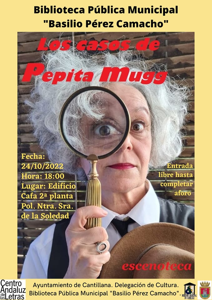 La Biblioteca Basilio Pérez Camacho y la delegación de Cultura del Ayuntamiento organizan para el próximo lunes 24 de octubre, a las 18:00, el cuentacuentos Los casos de Pepita Mugg, que hará que los niños y niñas pasen un buen rato de diversión y entretenimiento.