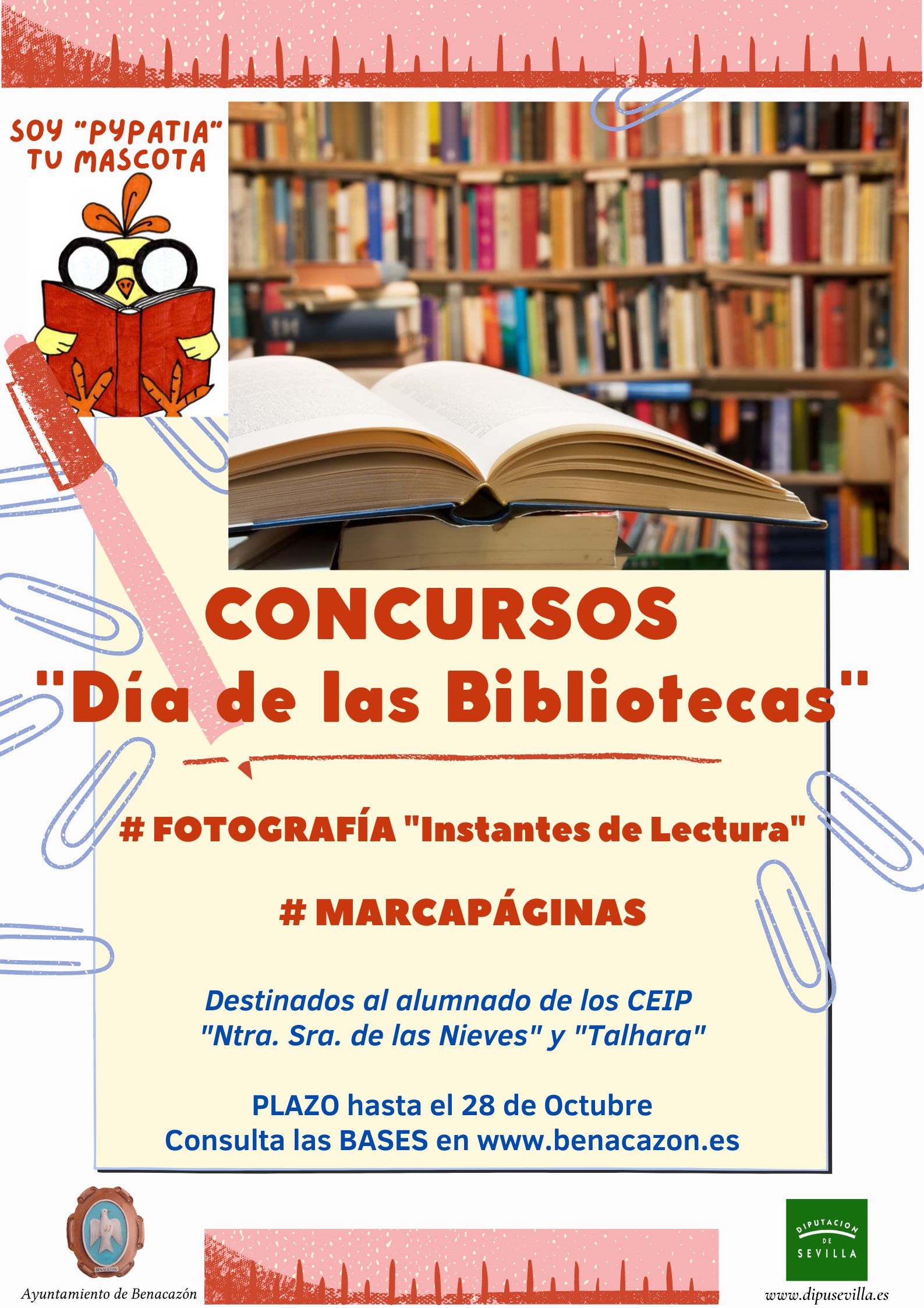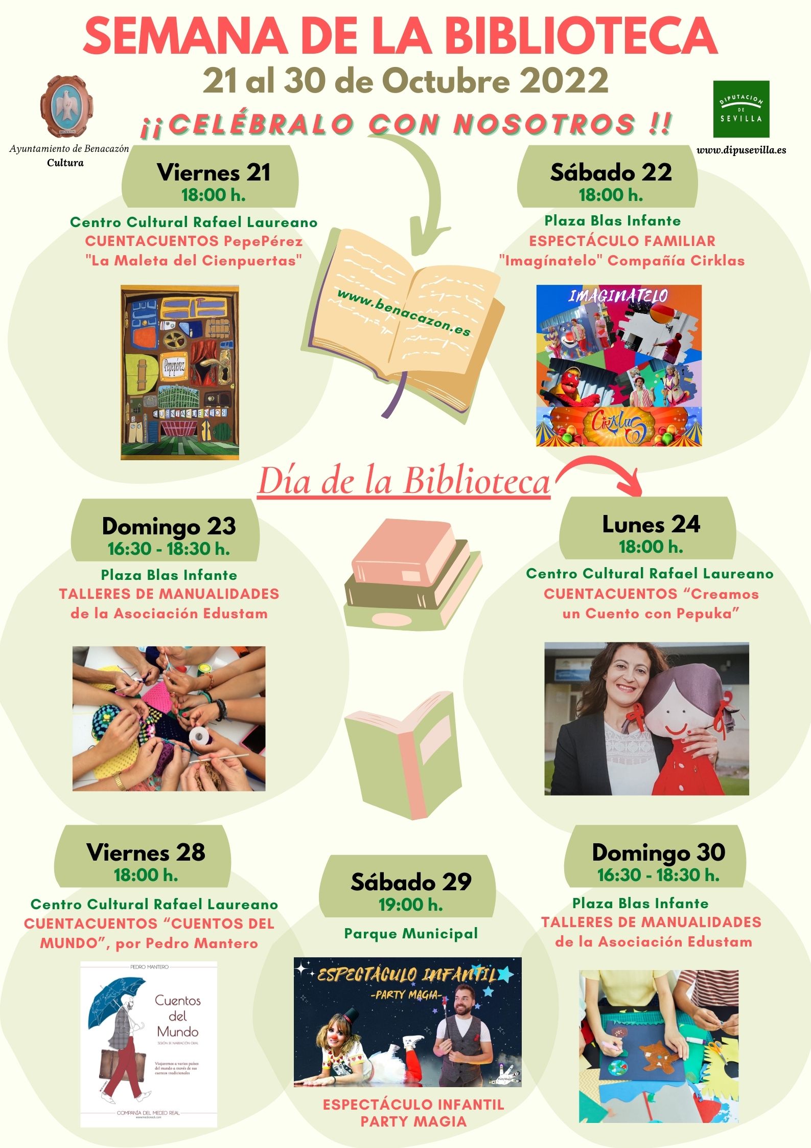 El Ayuntamiento de Benacazón presenta la Programación de Actividades organizadas por la Concejalía de Cultura en colaboración con la Diputación Provincial de Sevilla, para conmemorar el DÍA INTERNACIONAL DE LAS BIBLIOTECAS -que se celebra cada 24 de Octubre- y que se desarrollará del 21 al 30 de Octubre de 2022. Desde el área de Cultura, su Delegada Carmen Rocío Bautista os invita a participar en todas las actividades que desglosamos en el cartel con la programación, así como en los Concursos de Fotografía y Marcapáginas para el alumnado de los colegios Talhara y Ntra. Sra. de las Nieves, y el Curso "CONCEPTOS PICTÓRICOS CONTEMPORÁNEOS" que será impartido por el artista local Rafael Laureano, del que informaremos próximamente.