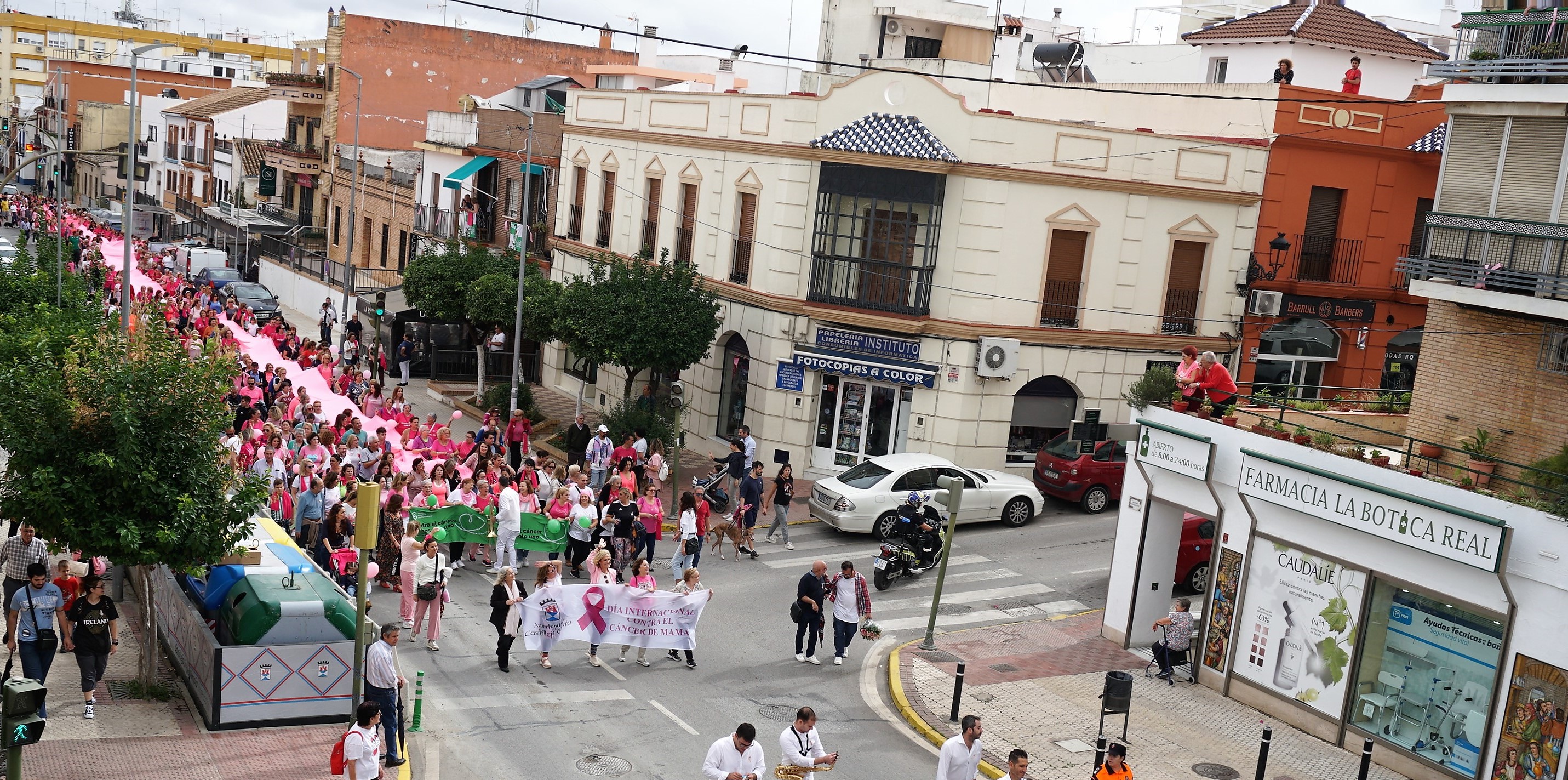 Castilleja de la Cuesta se ha volcado este domingo en apoyo al Día Internacional Contra el Cáncer de Mama con una gran marcha por el municipio, en la que han participado más de medio millar de vecinos y vecinas, portando una enorme tela rosa de 100 metros de largo, como símbolo de solidaridad con las personas afectadas por esta enfermedad y sus familias.