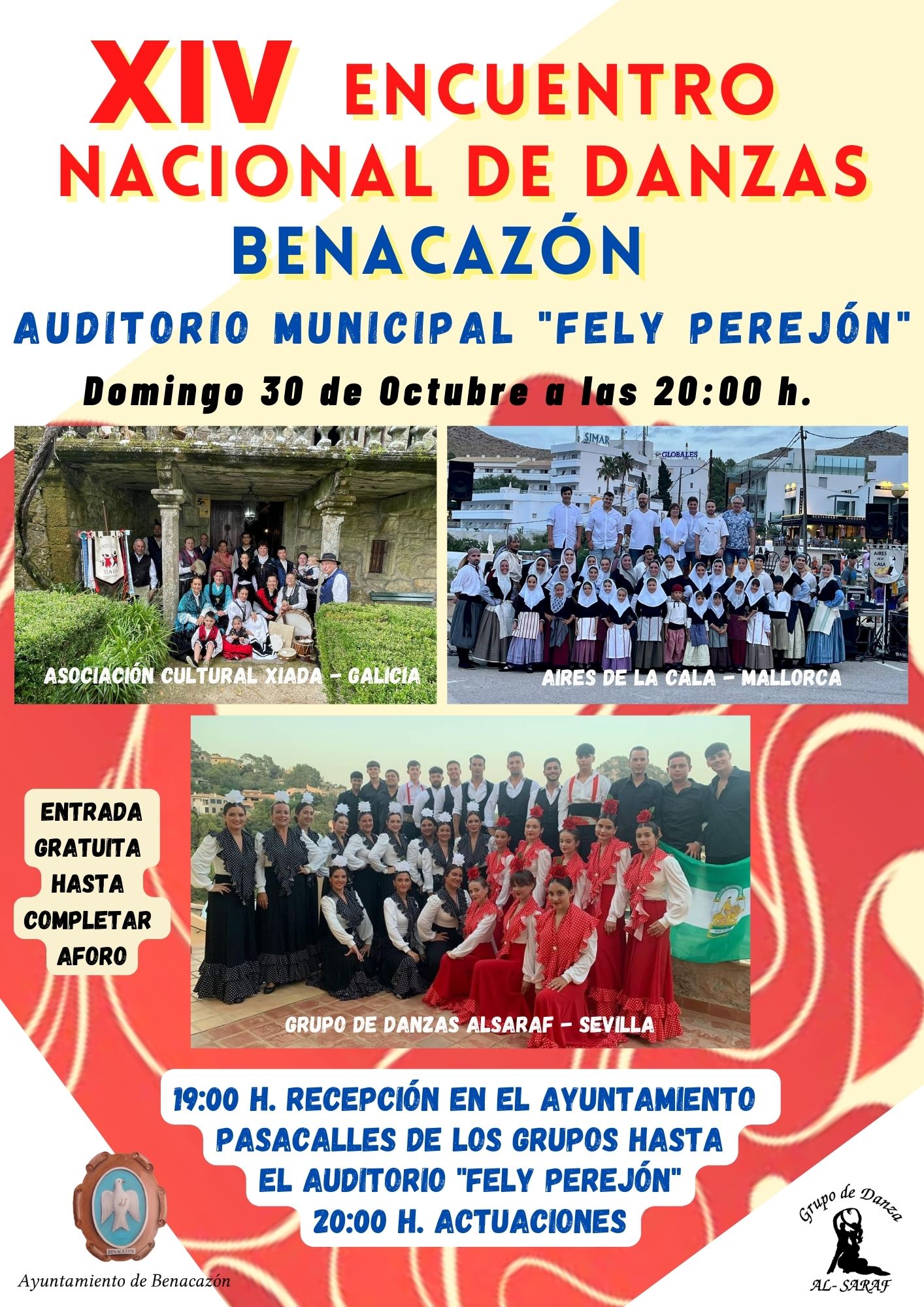 El Ayuntamiento de Benacazón informa sobre el tradicional "XIV ENCUENTRO NACIONAL DE DANZAS" que se celebrará el próximo domingo 30 de Octubre, a las 20:00 h., en el Auditorio Municipal "FELY PEREJÓN", organizado por el Grupo de Danza AL-SARAF con la colaboración del Ayuntamiento de Benacazón donde previamente, a las 19:00 h., tendrá lugar una Recepción a los grupos participantes (Aires de La Cala, de Mallorca; Asociación Cultural Xiada, de Galicia y el Grupo de Danza anfitrión: Al-Saraf (Sevilla).