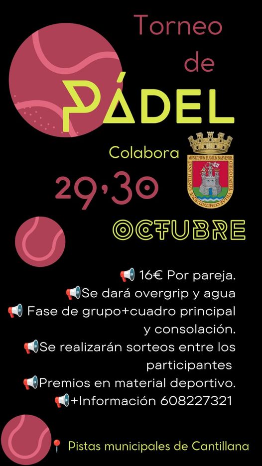 Las pistas municipales de Cantillana acogerán los días 29 y 30 de octubre un torneo de pádel organizado por el el Club de Pádel Cantillana y la Delegación de Deportes del Ayuntamiento de Cantillana.