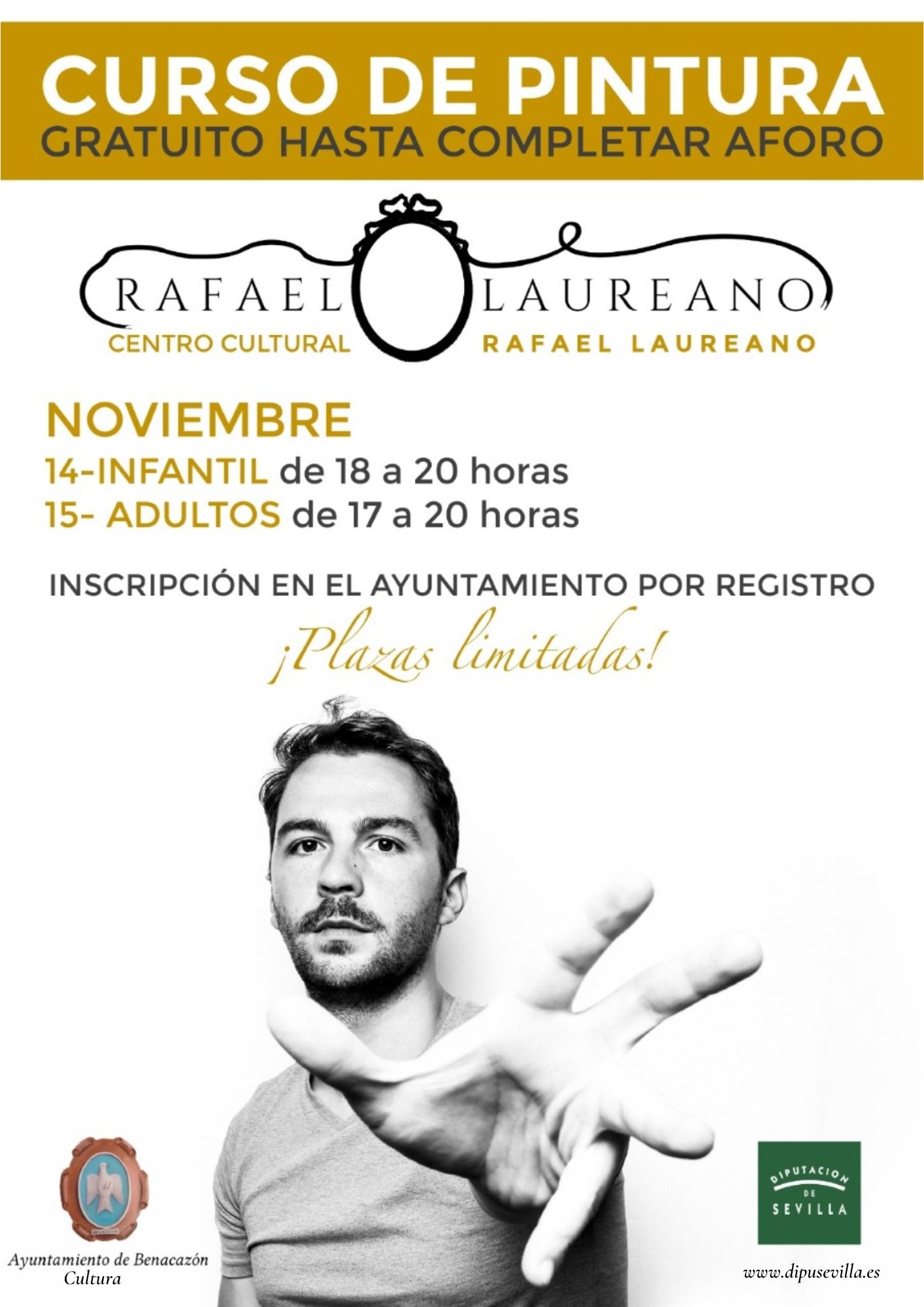 El Ayuntamiento de Benacazón informa sobre el CURSO GRATUITO DE PINTURA "CONCEPTOS PICTÓRICOS CONTEMPORÁNEOS", que será impartido los días 14 y 15 de Noviembre por el artista local RAFAEL LAUREANO, en dos modalidades: infantil (destinado a ñiños de 6 a 13 años), el día 14 de Noviembre de 18:00 a 20:00 horas, y para adultos el 15 de Noviembre de 17:00 a 20:00 horas.
