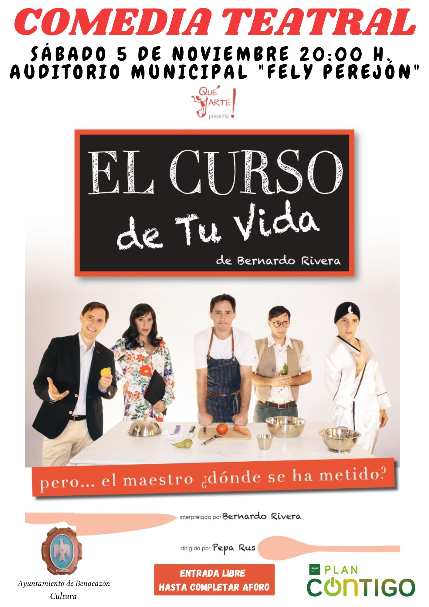 "EL CURSO DE TU VIDA" será representada el Sábado 5 de Noviembre a las 20:00 h. La compañía de teatro Qué jArte presenta en Benacazón esta comedia, bajo la dirección de Pepa Rus. Escrita e interpretada por Bernardo Rivera. Espectáculo protagonizado por un único actor que da vida a cinco personajes, que surgen y coinciden en un curso de cocina que cambiará sus vidas para siempre. "Una comedia fresca y muy entretenida, de esas que parece que las cosas ocurren sin más razón y después descubres que todo estaba perfectamente hilado".