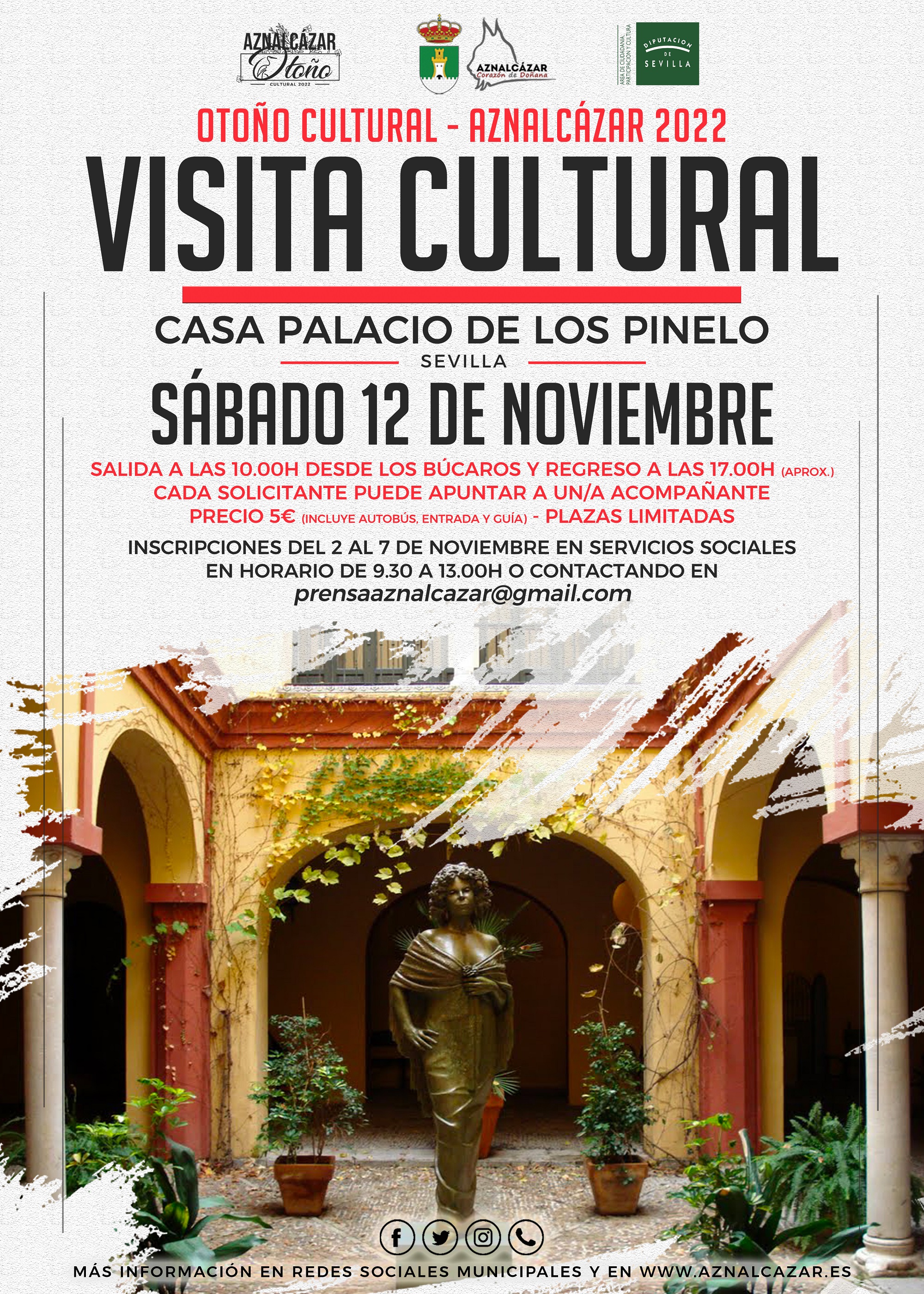 Enmarcada en la programación del Otoño Cultural, desde el área de Servicios Sociales, se ha organizado la visita guiada al Palacio de los Pinelos (Sevilla) que forma parte de un prototipo de casas-palacio de origen medieval, revestido con decoración renacentista. La visita está prevista para el sábado 12 de noviembre. Salida a las 10:00h (desde Los Búcaros) y vuelta a las 17:00h (aproximadamente) Precio: 5€ (incluye bus, entrada y guía) Inscripciones: del 2 al 7 de noviembre en horario de 9:30h a 13:00h en Servicios Sociales o a través del correo: prensaaznalcazar@gmail.com (DURANTE EL MISMO HORARIO) Cada persona podrá inscribir a un acompañante.