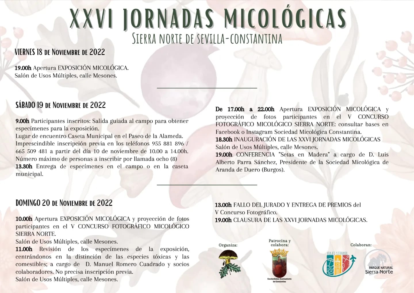 El Ayuntamiento de Constantina patrocina las XXVI Jornadas Micológicas de Constantina que se celebrarán del 18 al 20 de noviembre de 2022 y que organiza la Sociedad Micológica Sierra Norte de Sevilla.
