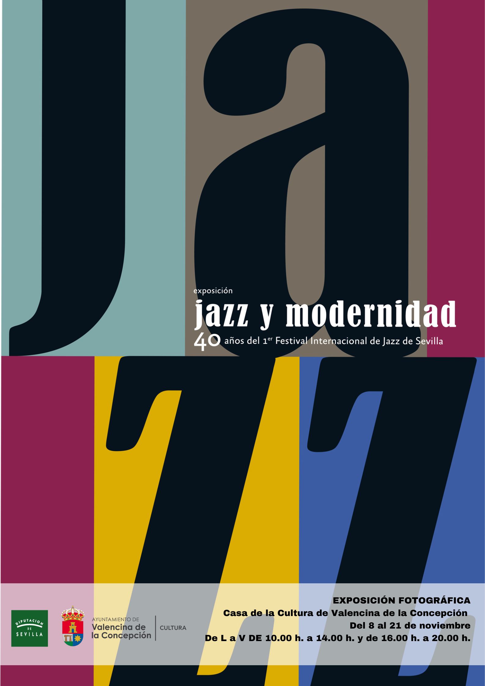 Descripción: Esta exposición establece un interesante y atractivo recorrido documental por la Historia del Jazz en Sevilla -desde el año 29 hasta la actualidad-, centrada especialmente en la década de los 80, años éstos de esplendor del Festival Internacional de Jazz de Sevilla, que fue impulsado y organizado por la Diputación de Sevilla, en una apuesta necesaria, valiente, fresca e innovadora realizada desde una Administración Pública, que apostó por los jóvenes y por la cultura, y que logró que la ciudad de Sevilla se situará como punto de referencia del Jazz en Europa, por el nivel de excelencia alcanzado en este Festival.