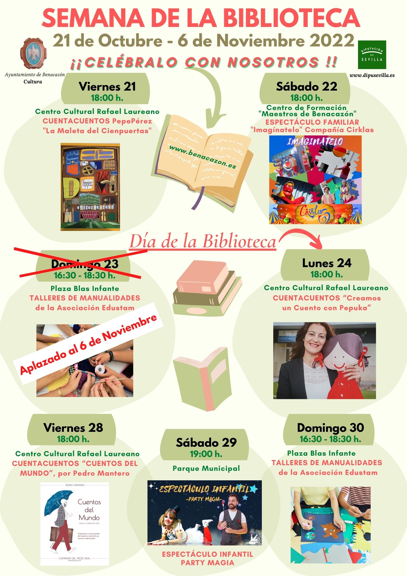 - Lunes 24, DÍA DE LAS BIBLIOTECAS, 18:00 h. (Centro Cultural Rafael Laureano), CUENTACUENTOS "Creamos un Cuento con Pepuka".