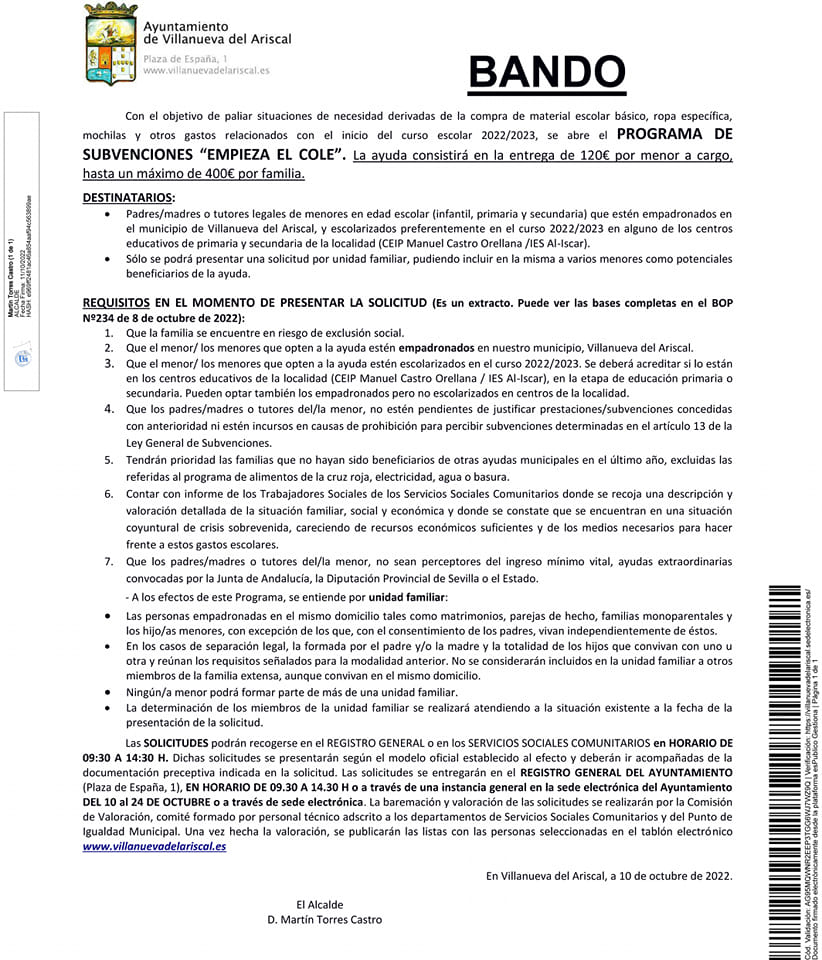 Aquí te dejamos el BANDO con toda la información. Plazo para solicitar la ayuda si se cumplen los requisitos, hasta el próximo 24 de octubre.