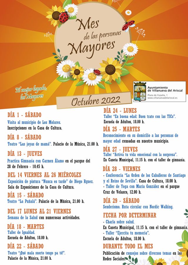 Este año volvemos a dedicar el mes de octubre a las personas mayores y por ello hemos organizado distintas actividades desde diferentes áreas de nuestro Ayuntamiento en las que esperamos vuestra participación.