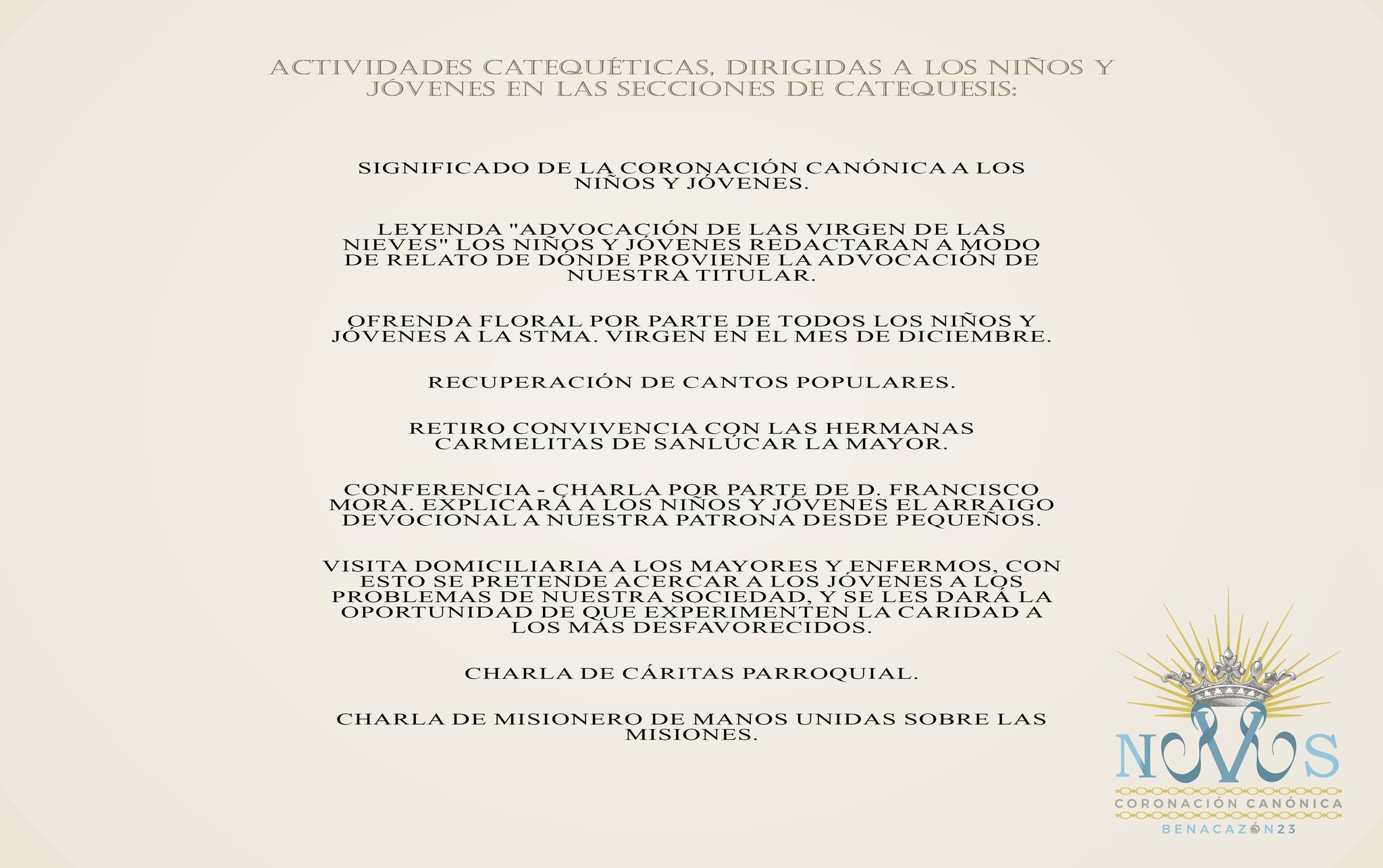 Desde el Ayuntamiento de Benacazón, a través de la Comisión de Nuestra Señora de las Nieves, damos a conocer la "Programación Extraordinaria" preparatoria para la próxima Coronación Canónica de la Virgen de las Nieves, que se celebrará el día 6 de Mayo de 2023. Desde ahora comienza un nuevo camino hacia la culminación de uno de los logros más importantes en la historia de esta localidad, la CORONACIÓN CANÓNICA de nuestra Patrona.