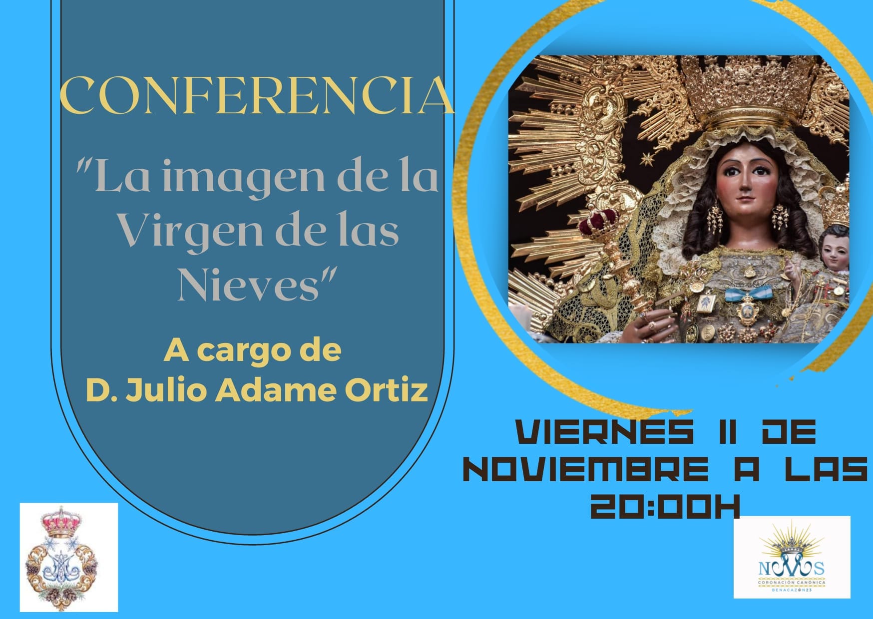 El viernes día 11 de noviembre, a las 20:00 h. en la Iglesia Parroquial de Santa María de las Nieves, tendrá lugar la primera de las Conferencias que recoge el Programa de Actos Extraordinarios con motivo de la Coronación Canónica de nuestra Patrona.