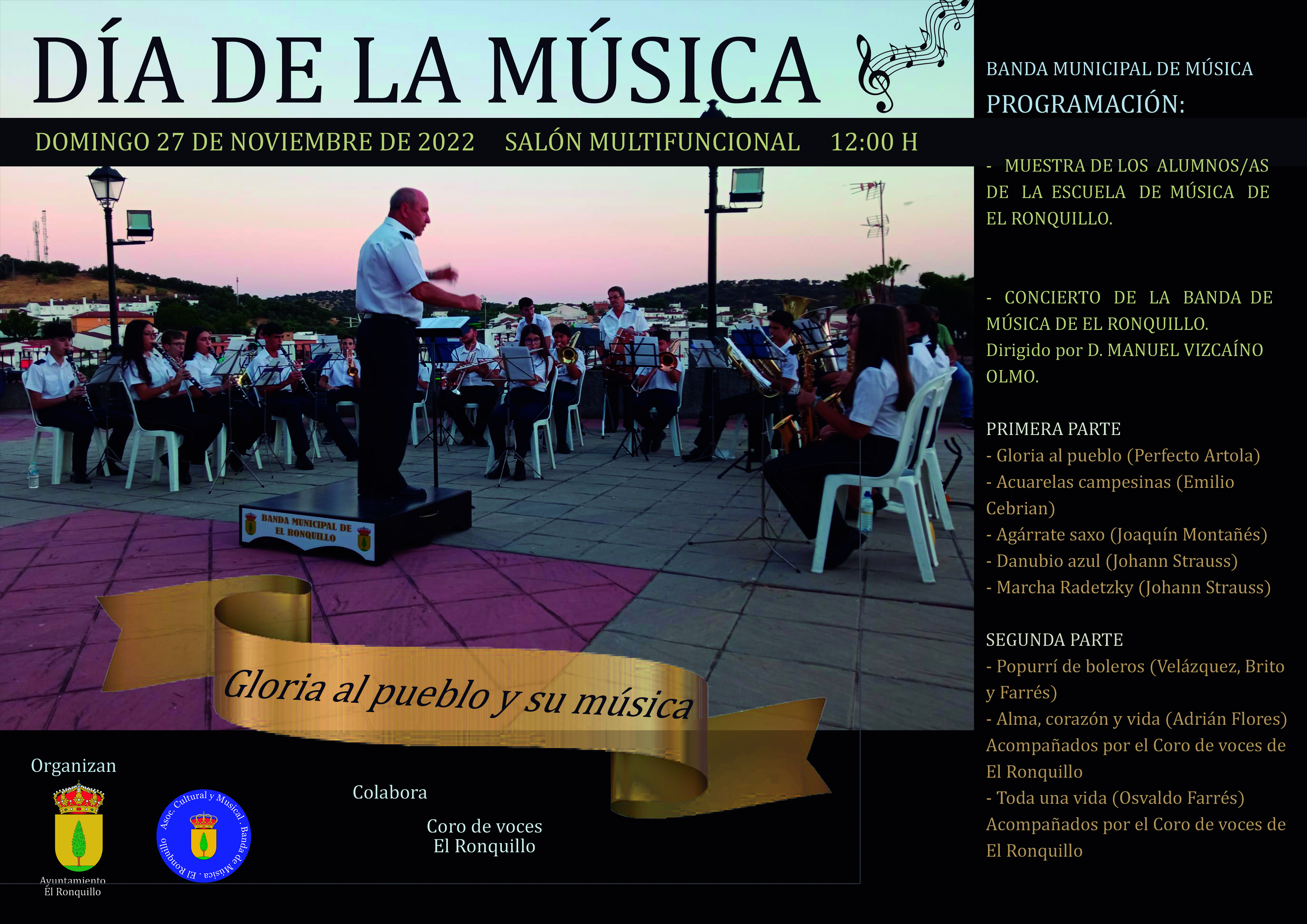 El domingo 27 de noviembre celebraremos en El Ronquillo el DÍA DE LA MÚSICA con el evento musical "Gloria al pueblo" a cargo de la Banda y Escuela Municipal de Música de El Ronquillo.