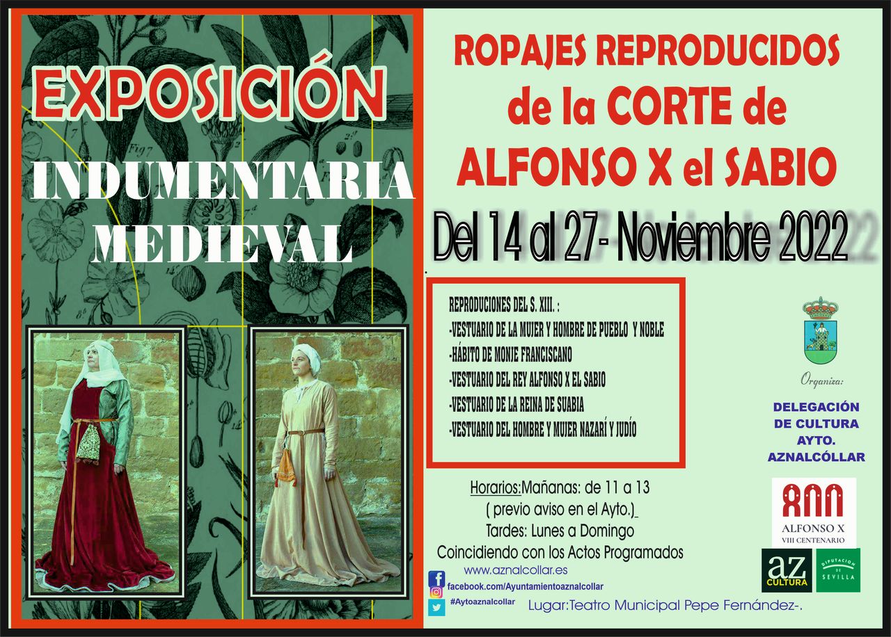 desde el día 14 al 27 de Noviembre una exposición sobre la indumentaria de la corte de Alfonso X El Sabio. Una muestra con motivo de la celebración del VIII centenario de Alfonso X, el sabio, y como completo para el Certamen Nacional de Teatro Aficionado Villa Aznalcóllar 2022 que se está celebrando con compañías de gran nivel.