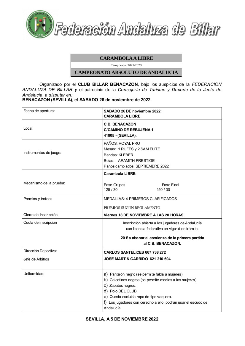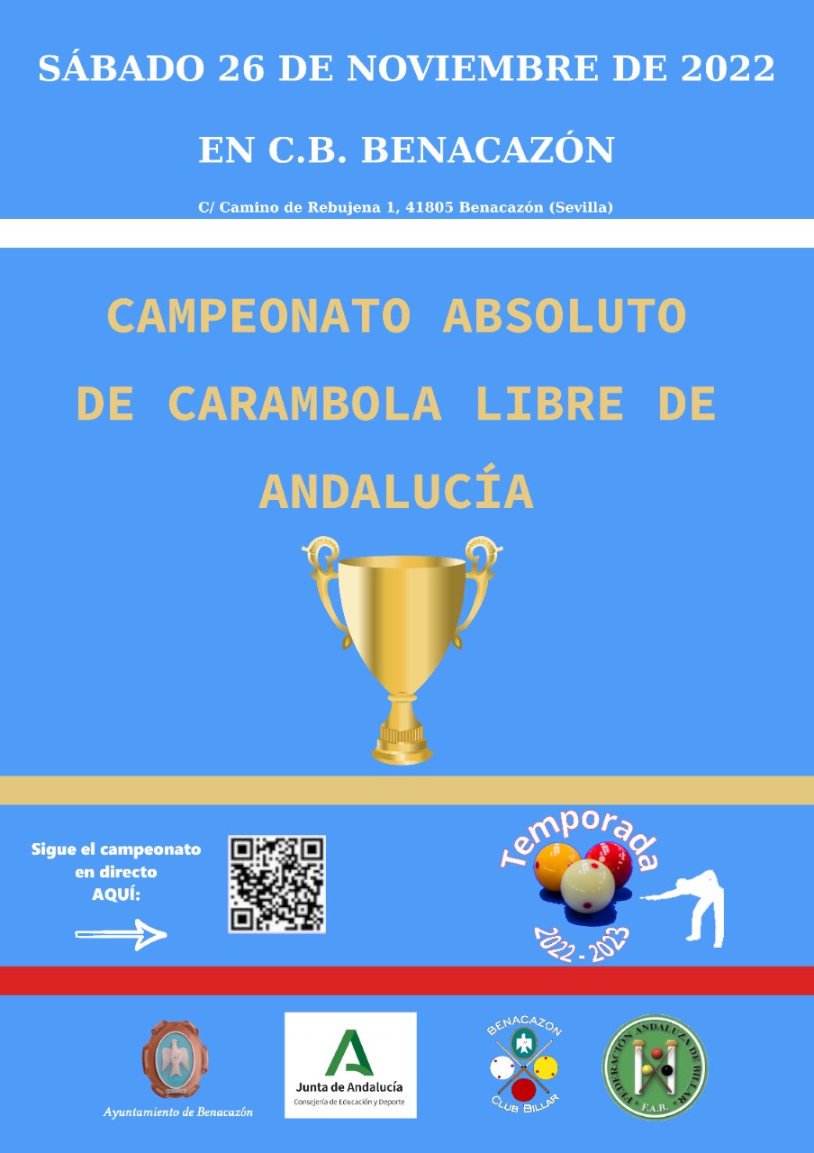 El Ayuntamiento de Benacazón informa sobre la celebración del "CAMPEONATO ABSOLUTO DE CARAMBOLA LIBRE DE ANDALUCÍA", organizado por el CLUB BILLAR BENACAZÓN, que tendrá lugar en la sede del club (Camino de Rebujena 1). Bajo los auspicios de la FEDERACIÓN ANDALUZA DE BILLAR y el patrocinio de la Consejería de Turismo y Deporte de la Junta de Andalucía, con la colaboración de la Concejalía de Deportes del Ayuntamiento de la localidad.