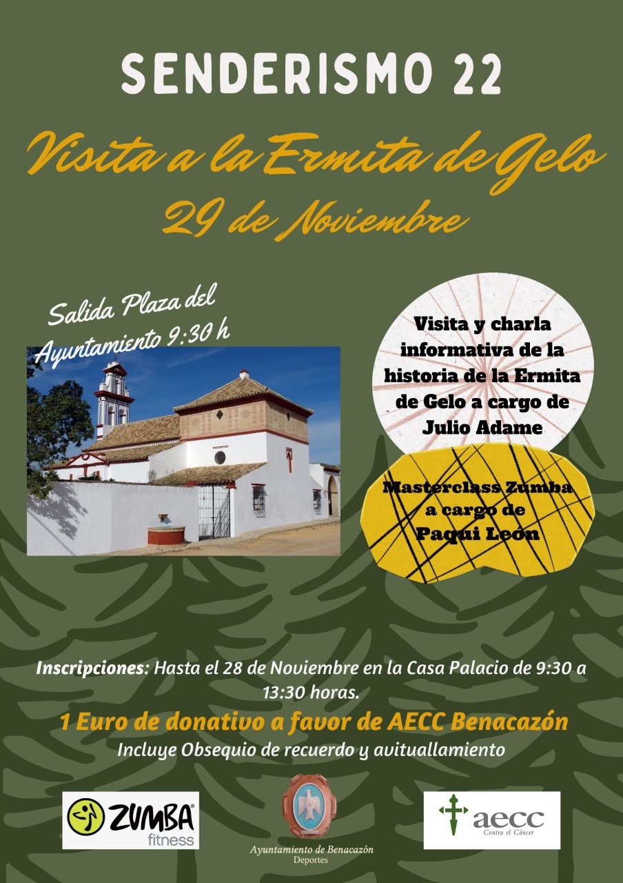 El Ayuntamiento de Benacazón informa sobre el SENDERISMO A LA ERMITA DE GELO que tendrá lugar el martes 29 de Noviembre a partir de las 09:30 h. desde la Plaza del Ayuntamiento (Blas Infante). Una actividad organizada por la Delegación municipal de Deportes, que consistirá en una Visita y Charla Informativa de la Historia de la Ermita, guiada por el Animador Turístico del Plan Contigo Julio Adame. Además, habrá una Masterclass de Zumba a cargo de la monitora Paqui León.