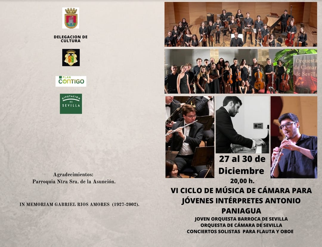 El Ayuntamiento de Cantillana presentó ayer en la Casa de la Provincia de la Diputación de Sevilla la sexta edición del Ciclo de Música de Cámara para Jóvenes Intérpretes Antonio Paniagua, que se desarrollará del 27 al 30 de diciembre en los escenarios emblemáticos de las Ermitas de Nuestra Señora de la Soledad y San Bartolomé y la Iglesia Parroquial de Nuestra Señora de la Asunción.