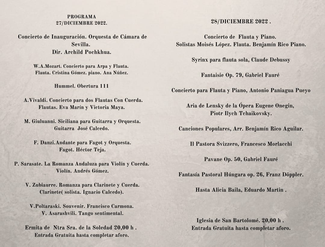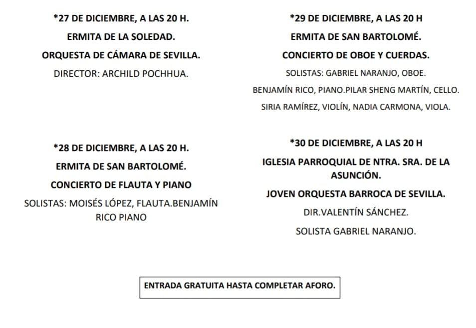 El concierto inaugural será en la Ermita de la Soledad el día 27 a cargo de la Orquesta de Cámara de Sevilla, dirigida por Archild Pochkhua, con un programa que incluye composiciones de Mozart, Hummel, Vivaldi, Giuluanni, Danzi, Sarasate, Zubiaurre, Poltaraski y Asarashvili, interpretadas por Cristina Gómez (flauta), Ana Núñez (piano), Eva Marín (flauta), Victoria Maya (flauta), José Calcedo (guitarra), Héctor Teja (fagot), Andrés Gómez (violín) e Ignacio Calcedo (clarinete).