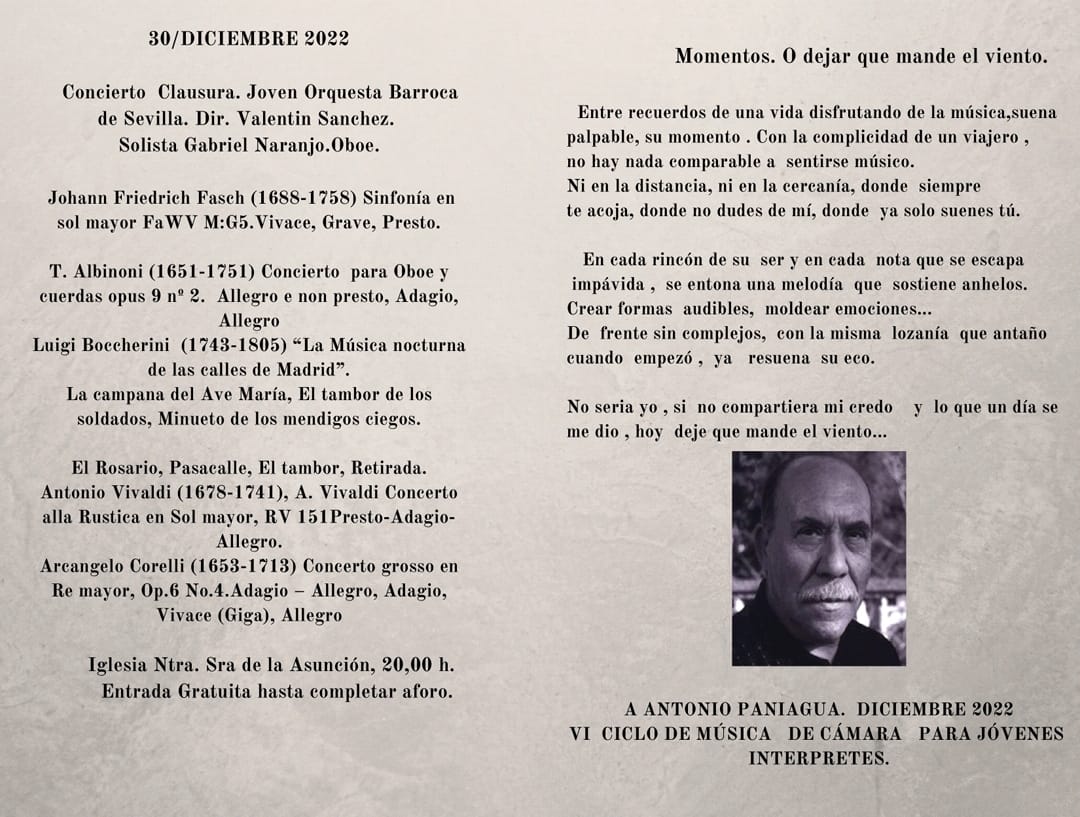 Por último, el concierto de clausura será el día 30 en la Iglesia Parroquial de Nuestra Señora de la Asunción, a cargo de la Joven Orquesta Barroca de Sevilla, dirigida por Valentín Sánchez y con Gabriel Naranjo como solista, al oboe. En el programa musical, piezas de Fasch, Albinoni, Boccherini, Vivaldi y Corelli.