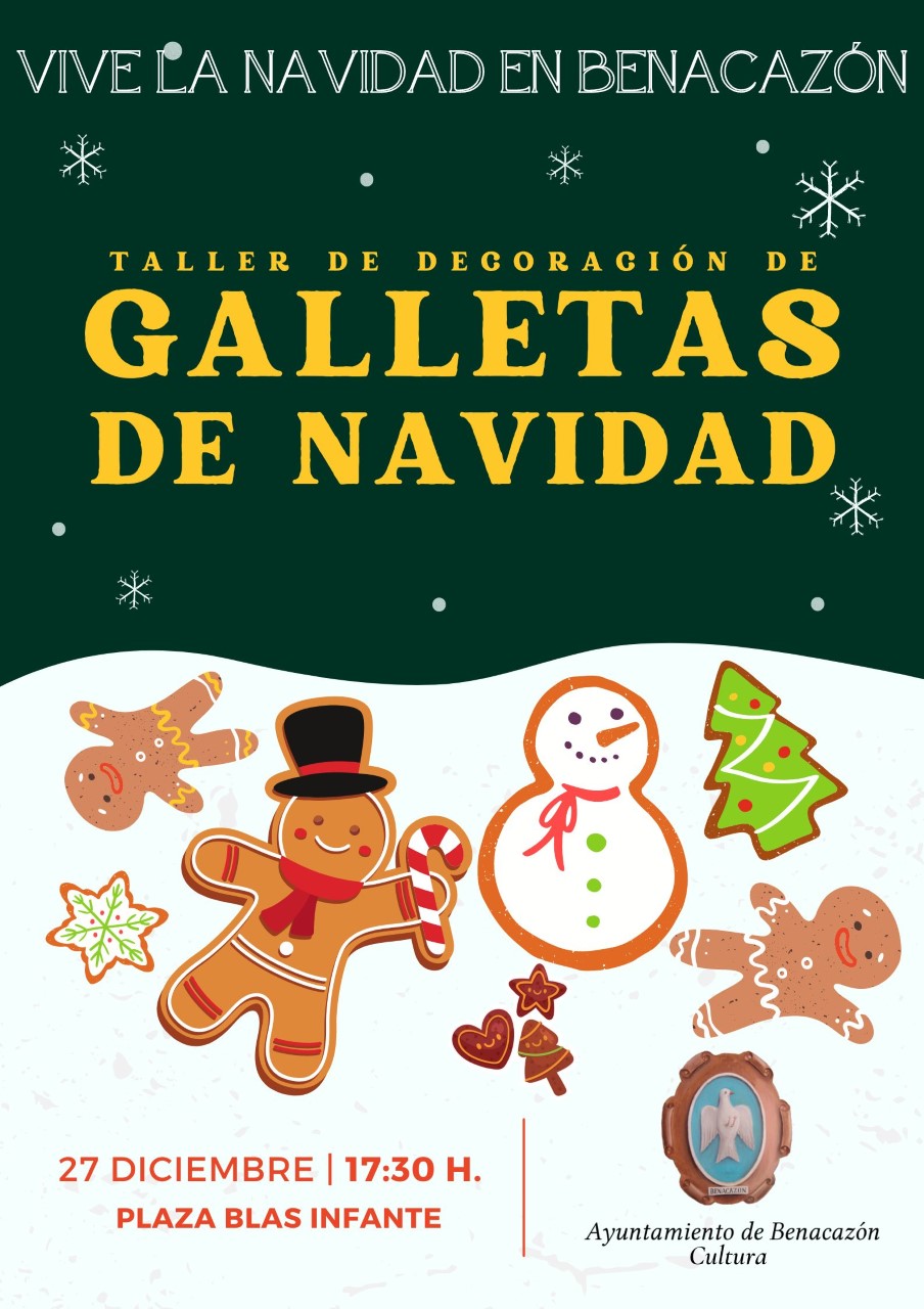 El Ayuntamiento de Benacazón informa sobre el TALLER INFANTIL DE DECORACIÓN DE GALLETAS DE NAVIDAD, que se impartirá el martes 27 de diciembre a las 17:30 horas en la Plaza Blas Infante, organizado por la Delegación municipal de Cultura dentro de la Programación "VIVE LA NAVIDAD EN BENACAZÓN".