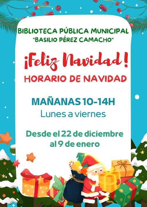 Desde el 22 de diciembre al 9 de enero, la Biblioteca Pública Municipal Basilio Pérez Camacho mantendrá sólo su horario matinal, de 10:00 a 14:00, de lunes a viernes.