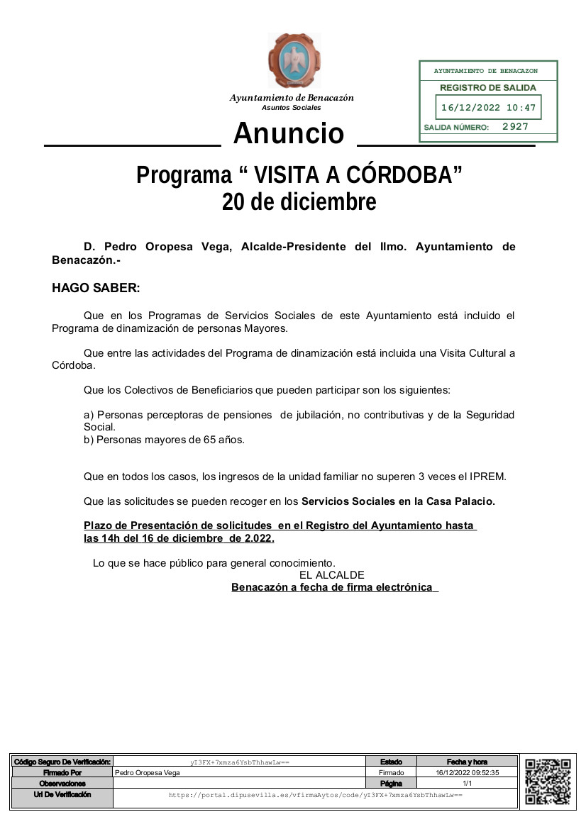 El Ayuntamiento de Benacazón informa que se ha abierto el Plazo de Inscripción para la "VISITA CULTURAL A CÓRDOBA" que tendrá lugar el martes 20 de Diciembre, organizada por la Delegación de Asuntos Sociales a través del Programa de Dinamización de Personas Mayores jubiladas.