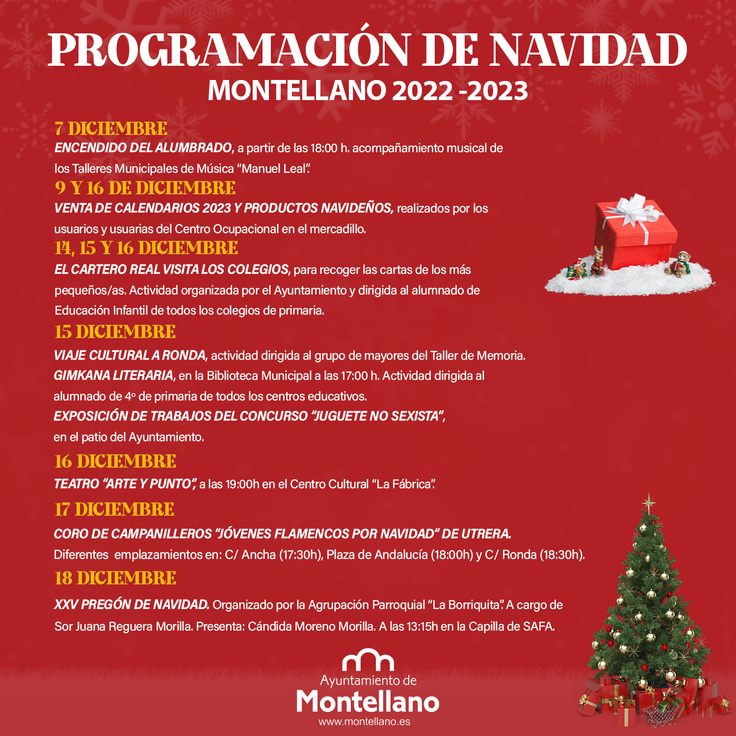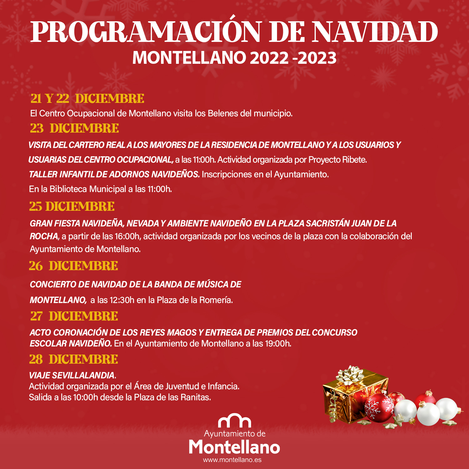 Desde el Ayuntamiento de Montellano, a través de las áreas de Festejos y Cultura y Turismo, se han programado diversas citas navideñas, a las que se suman las actividades organizadas desde colectivos, grupos vecinales y asociaciones del pueblo que vienen a completar un mes cargado de vida, celebraciones y convivencia entre todos los montellaneros y las montellaneras así como las personas que nos visiten estos días.