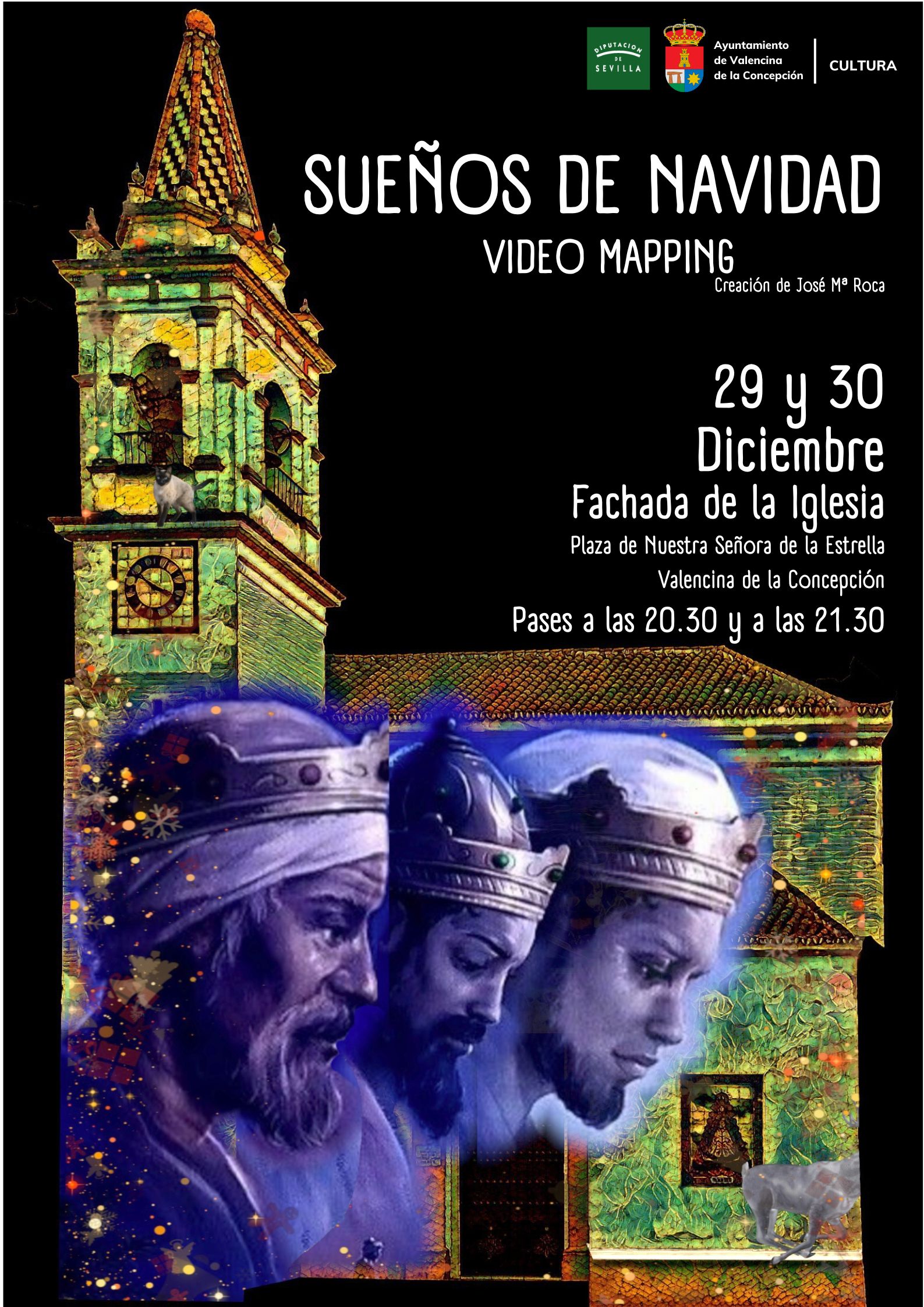 Este espectáculo cultural audiovisual proyectado sobre la fachada de la Iglesia Nuestra Señora de la Estrella, en la plaza homónima, se realizará los días 29 y 30 de diciembre, con pases a las 20.30 h. y 21.30 h. Contaremos también con la actuación del Coro de la Hermandad de Torrijos el día 29, y del Coro de la Hermandad del Rocío de Valencina y de su Coro Infantil para el día 30. Agradecer desde el Ayuntamiento de Valencina a ambas Hermandades su colaboración en este evento. Agradecer también al párroco, Félix María Casanova Lobo, su colaboración para que este espectáculo se pueda llevar a cabo. Esperemos sea del disfrute de todas y todos.