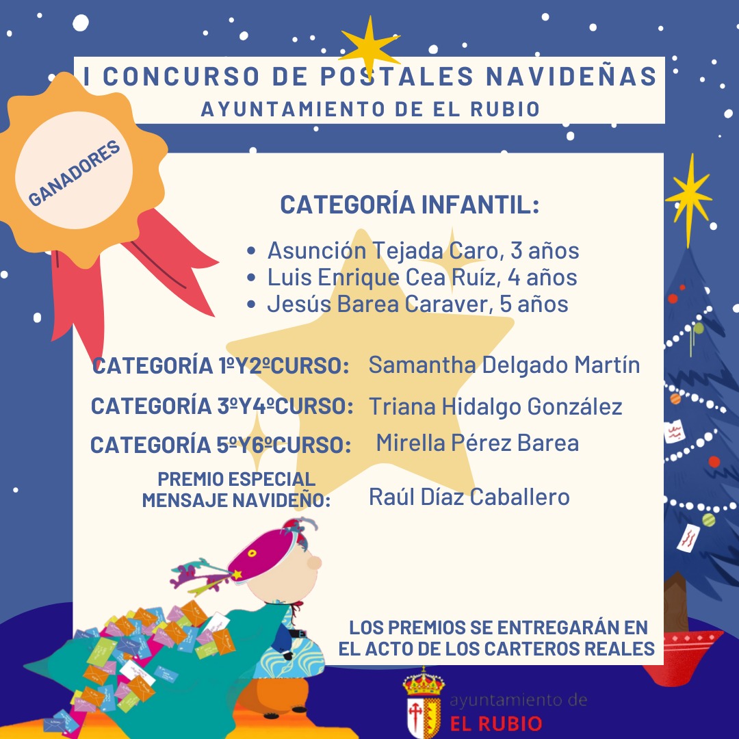 Los premios del I CONCURSO DE POSTALES NAVIDEÑAS del Ayuntamiento de El Rubio se entregarán durante la visita de los Carteros Reales, el jueves 29 de diciembre en la Plaza de España, a las 17:00h.