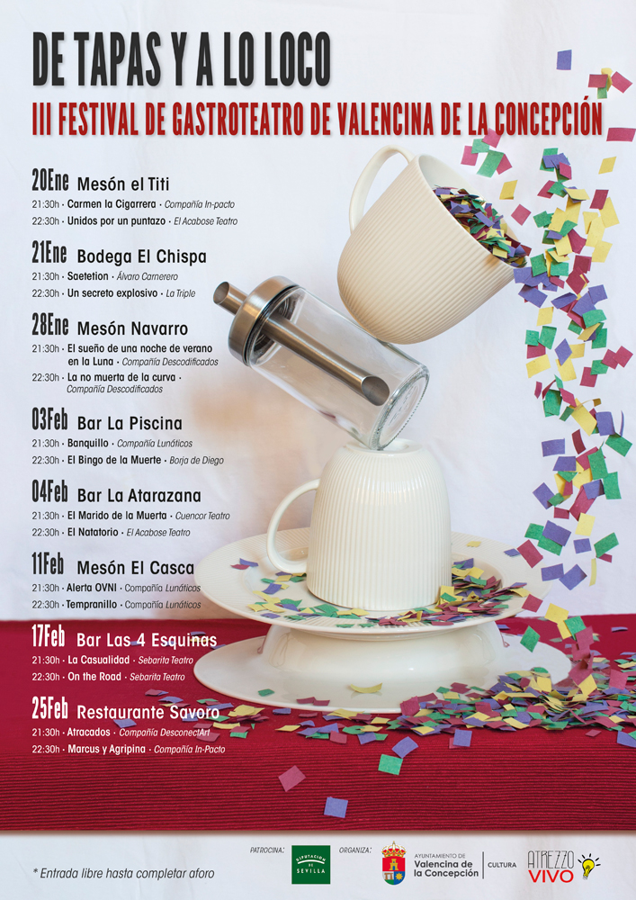 Las primeras sesiones de la tercera edición del festival de Gastroteatro de Valencina de la Concepción "De tapas y a lo loco" tendrán lugar el viernes 20, en el Mesón El Titi, y el sábado 21 de enero en la Bodega El Chispa.