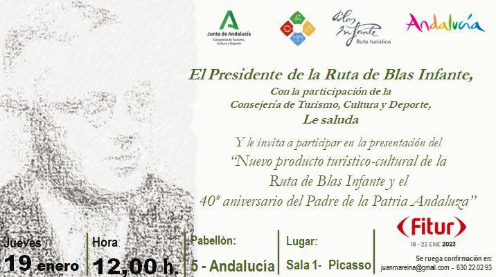 La Ruta de Blas Infante, de la que forma parte Cantillana, presentará en Fitur el jueves 19 de enero a las 12:00, su nueva etapa, tras diez años de actividad turística y cultural. Será en la Sala Picasso, del Pabellón nº 5 de Andalucía, por cortesía de la Consejería de Turismo, Cultura y Deporte de la Junta de Andalucía y su Empresa Pública, Turismo Andaluz.
