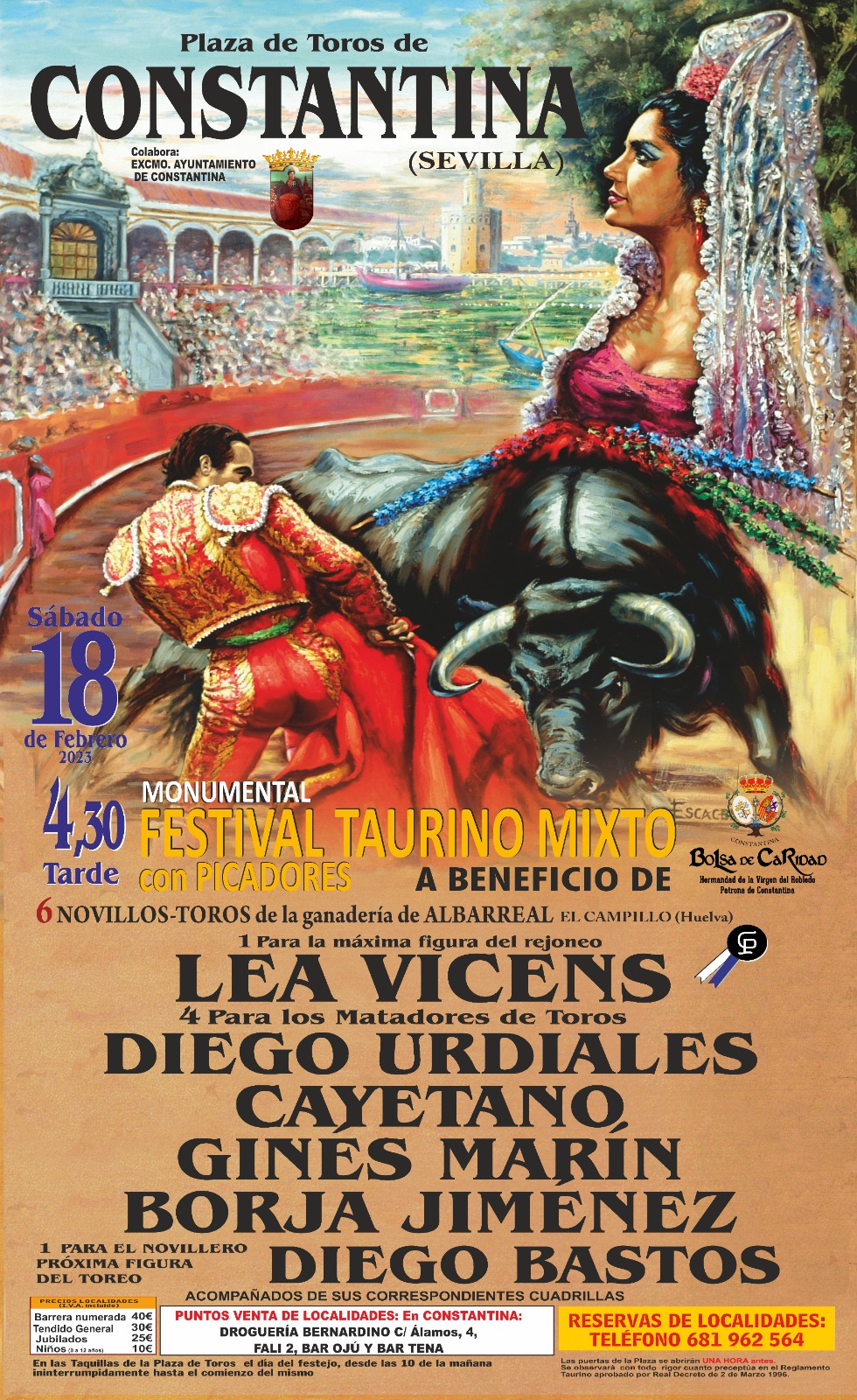 Organizado por TauroSevilla 2000, S.L., en colaboración con el Ayuntamiento de Constantina, el próximo sábado 18 de febrero de 2023, a las 16:30 horas en la Plaza de Toros de Constantina, se celebrará un Monumental Festival Taurino donde se lidiarán 6 toros y 1 novillo de la ganadería de Albarreal (El Campillo - Huelva), uno para la máxima figura del rejoneo, Lea Vicens; 4 para los afamados matadores Diego Urdiales, Cayetano, Ginés Marín y Borja Jiménez y nuestro paisano el novillero, próxima figura del toreo, Diego Bastos.