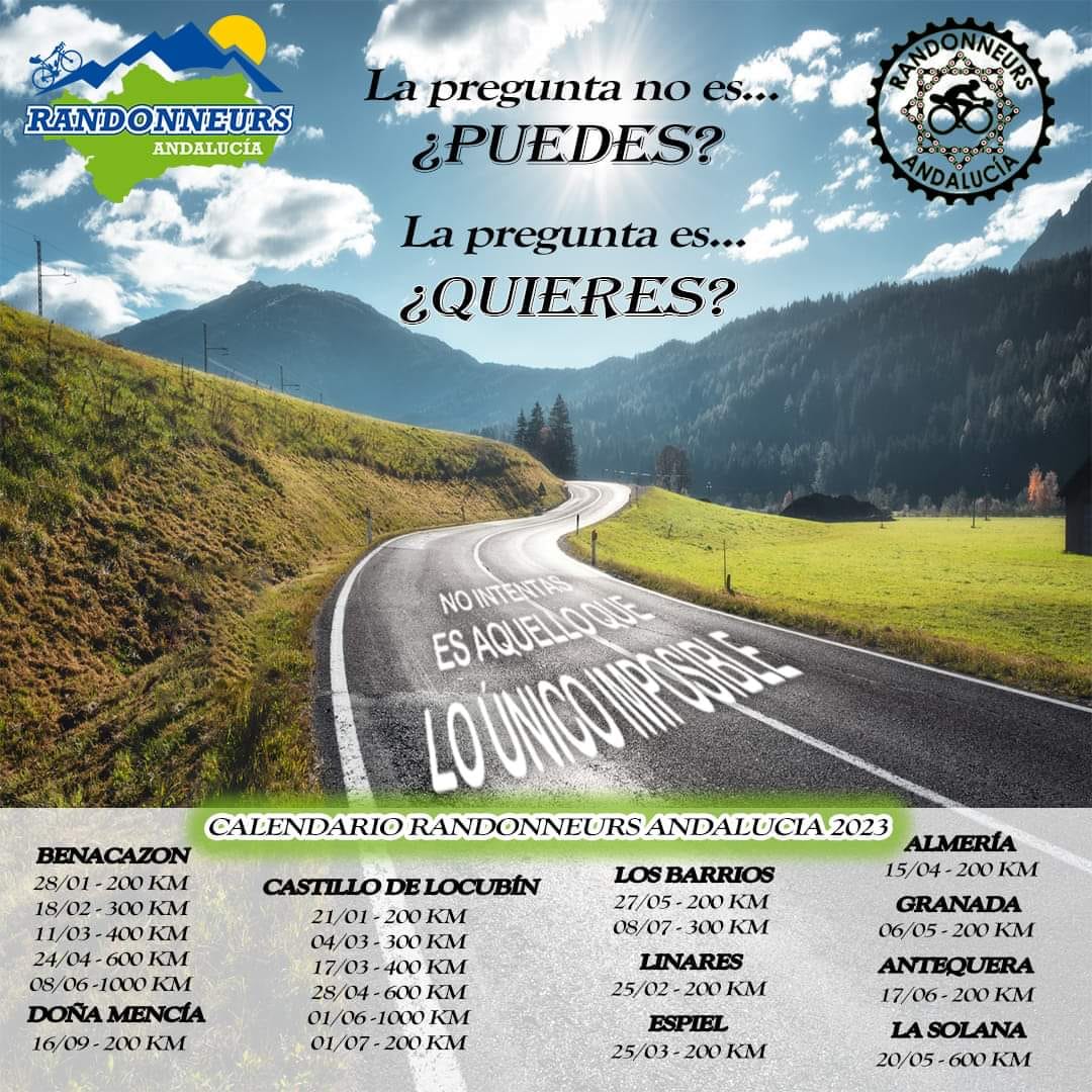 Desde el área de Deportes, animamos a participar a tant@s ciclistas de nuestro pueblo y alrededores aficionad@s al pedal. Para ello, contacta con el Club Randonneurs Andalucía o su Presidente Diego Ruiz en el 675 94 71 73.