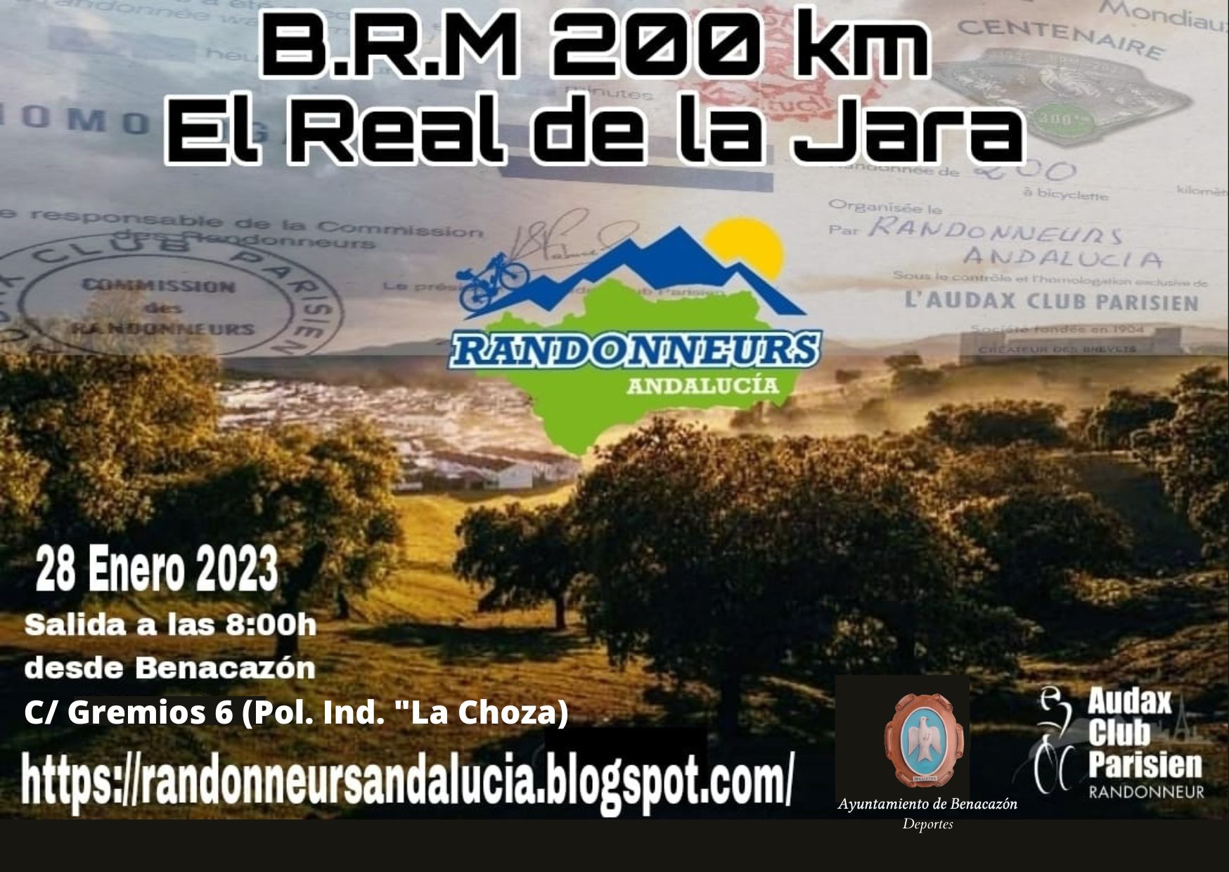 El Ayuntamiento de Benacazón informa que nuestro municipio acogerá en el mes de Enero una serie de sucesivas citas destacadas en el CALENDARIO RANDDONNEURS ANDALUCÍA 2023. Un importante evento organizado a través del Presidente de los Randonneurs Andalucía, el vecino Diego Ruiz Vega, contando con la colaboración de la Delegación de Deportes a través de su Concejal Diego Perejón Luna.