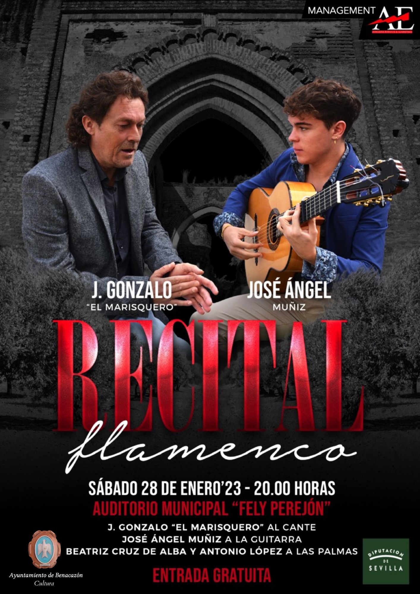 El Ayuntamiento de Benacazón informa sobre el RECITAL FLAMENCO que ofrecerá el vecino JOSÉ ÁNGEL MUÑIZ a la Guitarra y J. GONZALO "EL MARISQUERO" al Cante, con Beatriz Cruz de Alba y Antonio López a las Palmas, que tendrá lugar el Sábado 28 de Enero de 2023 a las 20:00 horas en el Auditorio Municipal "Fely Perejón".