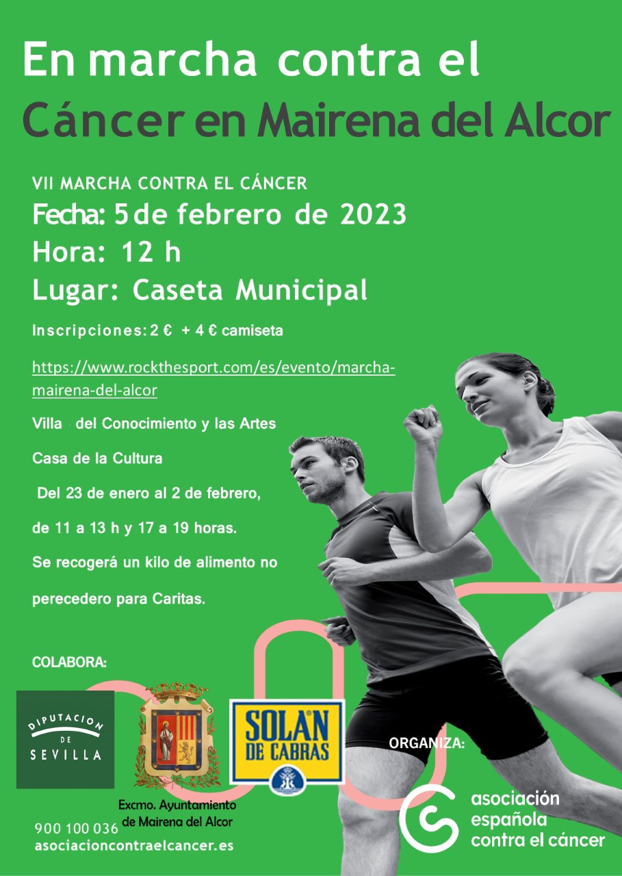 La Delegación de Salud informa que la VII Marcha contra el Cáncer se celebrará el domingo 5 de febrero con salida a las 12.00 horas desde la caseta municipal del recinto ferial. Todas las personas que quieran participar en la marcha tienen que inscribirse. El donativo es de 6 euros e incluye camiseta.