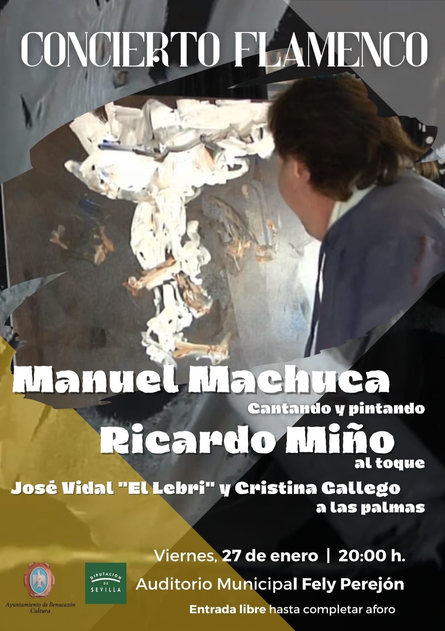 El Ayuntamiento de Benacazón informa sobre el Concierto del vecino MANUEL MACHUCA "CANTANDO Y PINTANDO", que tendrá lugar el Viernes 27 de Enero de 2023 a las 20:00 horas en el Auditorio Municipal "Fely Perejón", con Ricardo Miño al toque; José Vidal "El Lebri" y Cristina Gallego a las palmas.