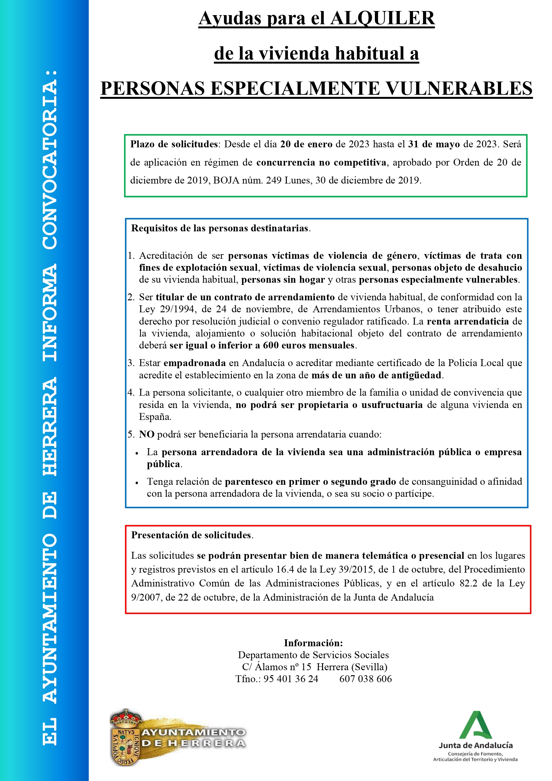 El Ayuntamiento de Herrera abre el plazo para el alquiler de la vivienda habitual a personas especialmente vulnerables. El periodo para realizar las solicitudes es desde el 20 de enero hasta el 31 de mayo de manera presencial o telemática.