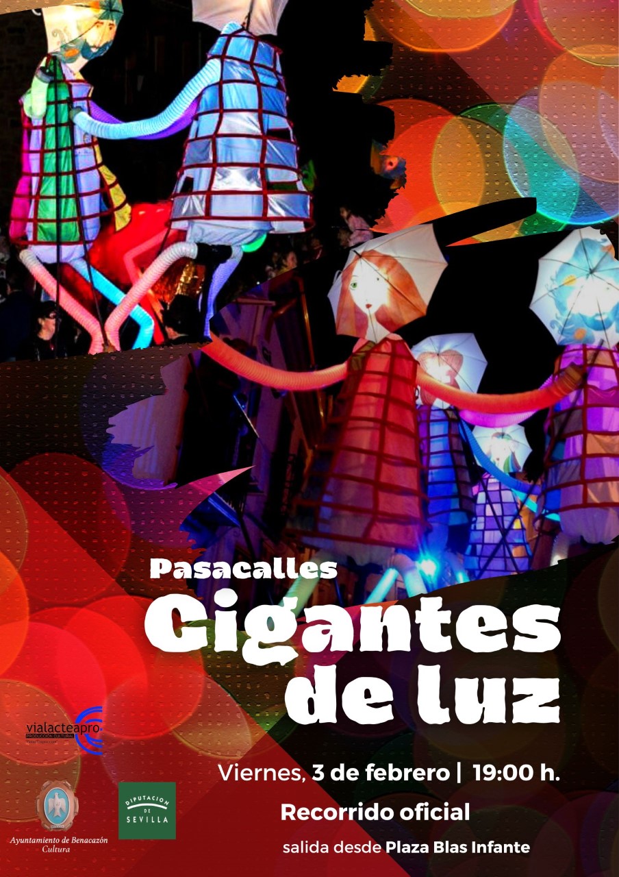 El Ayuntamiento de Benacazón informa sobre el Pasacalles nocturno GIGANTES DE LUZ, un espectáculo asombroso y lumínico en el que marionetas de grandes dimensiones (hasta 4 metros) desprenden luz gracias a dispositivos led, bailando al ritmo de la música, que tendrá lugar el Viernes 3 de Febrero a partir de las 19:00 horas desde la Plaza Blas Infante y por el recorrido oficial.