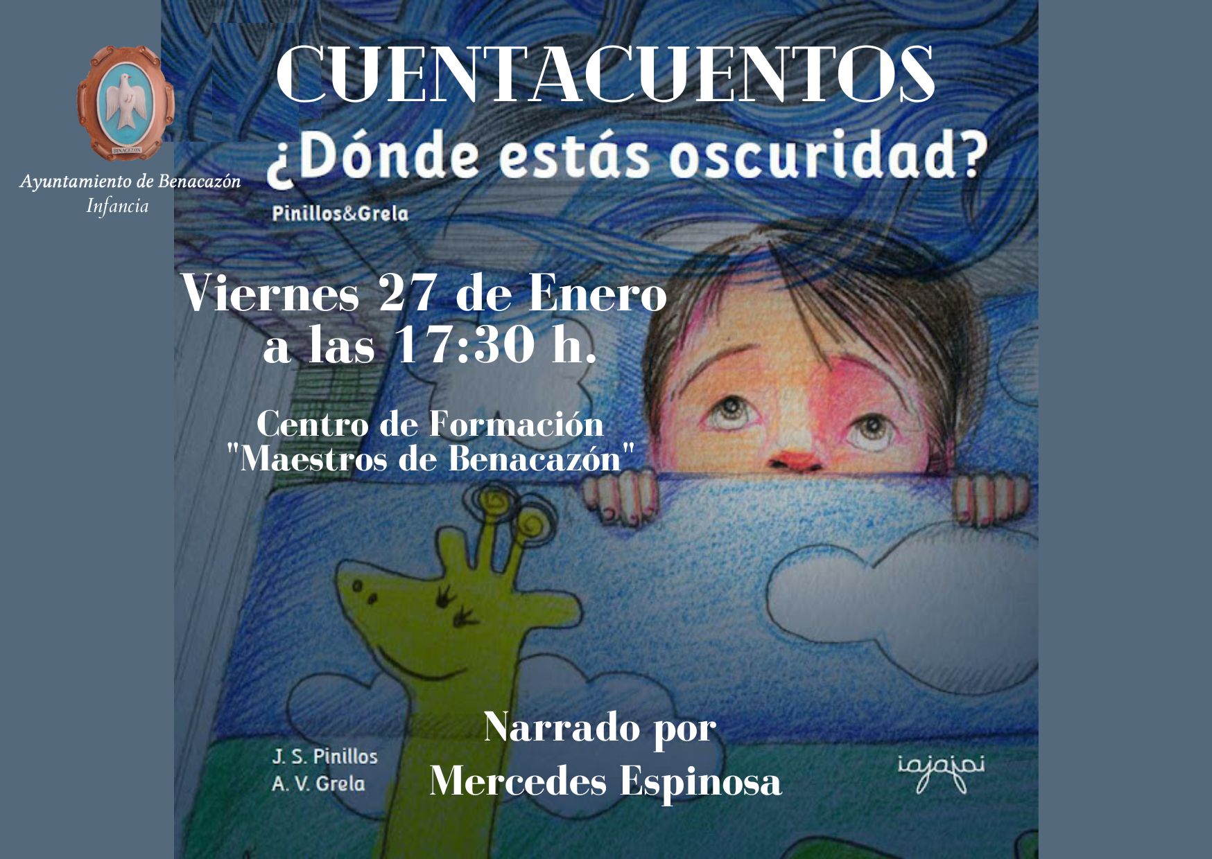 El Ayuntamiento de Benacazón informa sobre una nueva sesión de CUENTACUENTOS, el Viernes 27 de Enero a las 17:30 h. en el Centro de Formación 'Maestros de Benacazón': "¿DÓNDE ESTÁS OSCURIDAD?" -de Javier Sáenz Pinillos y A.V. Grela-, que será narrado por MERCEDES ESPINOSA, Delegada municipal del área de Infancia.
