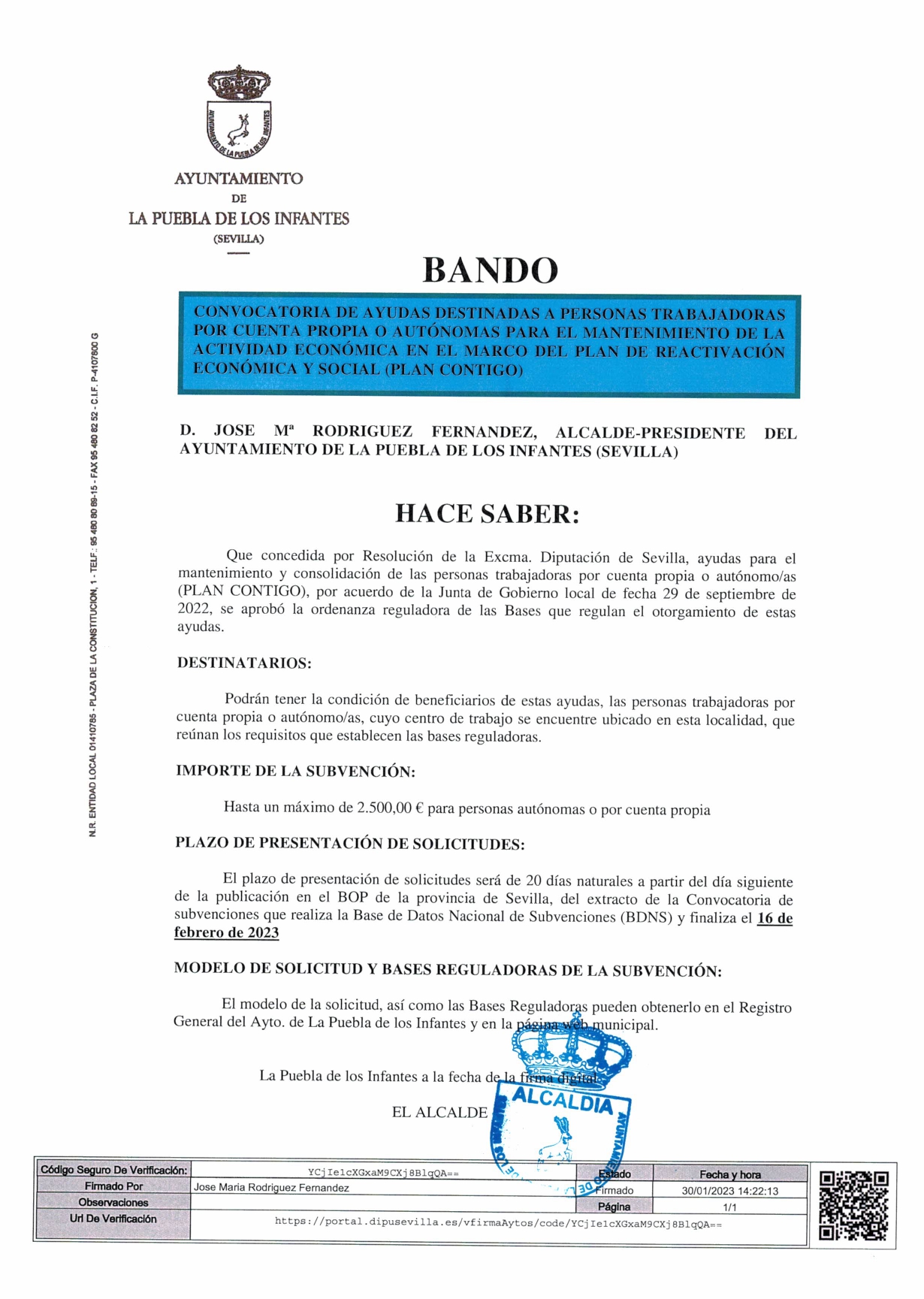 Ayuda mantenimiento autónomo Plan Contigo Ayuntamiento de La Puebla de los Infantes.