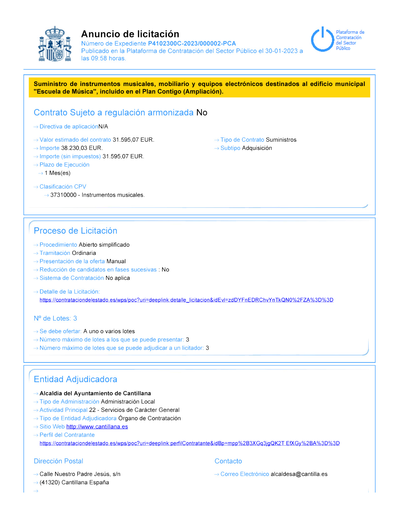 El Ayuntamiento de Cantillana ha iniciado proceso de licitación para la contratación del suministro de instrumentos musicales, mobiliario y equipos informáticos y electrónicos destinados al edificio municipal 'Escuela de Música', mediante Procedimiento Abierto Simplificado con tramitación reducida, incluida en la ampliación del Plan de Reactivación Económica y Social de la Provincia de Sevilla 2020-2021, denominado 'Plan Contigo', enmarcado en el Programa de Empleo y Apoyo Empresarial. El valor estimado del contrato es de 31.595,07 euros.