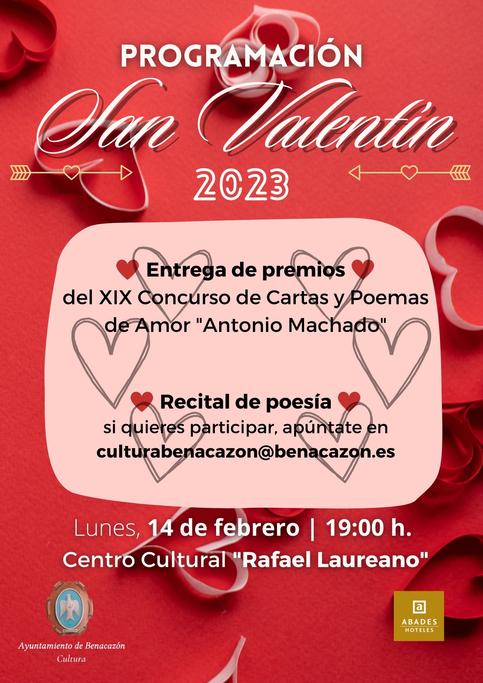 El Ayuntamiento de Benacazón informa sobre el Acto de Entrega de Premios del Concurso de Cartas y Poemas de Amor "Antonio Machado" y RECITAL DE POESÍA, que tendrá lugar el Martes 14 de Febrero a las 19:00 horas en el Centro Cultural Rafael Laureano (C/ San Pedro, 4). Si deseas participar, tanto en el Recital de Poesía como en el Concurso, apúntate en el correo culturabenacazon@benacazon.es