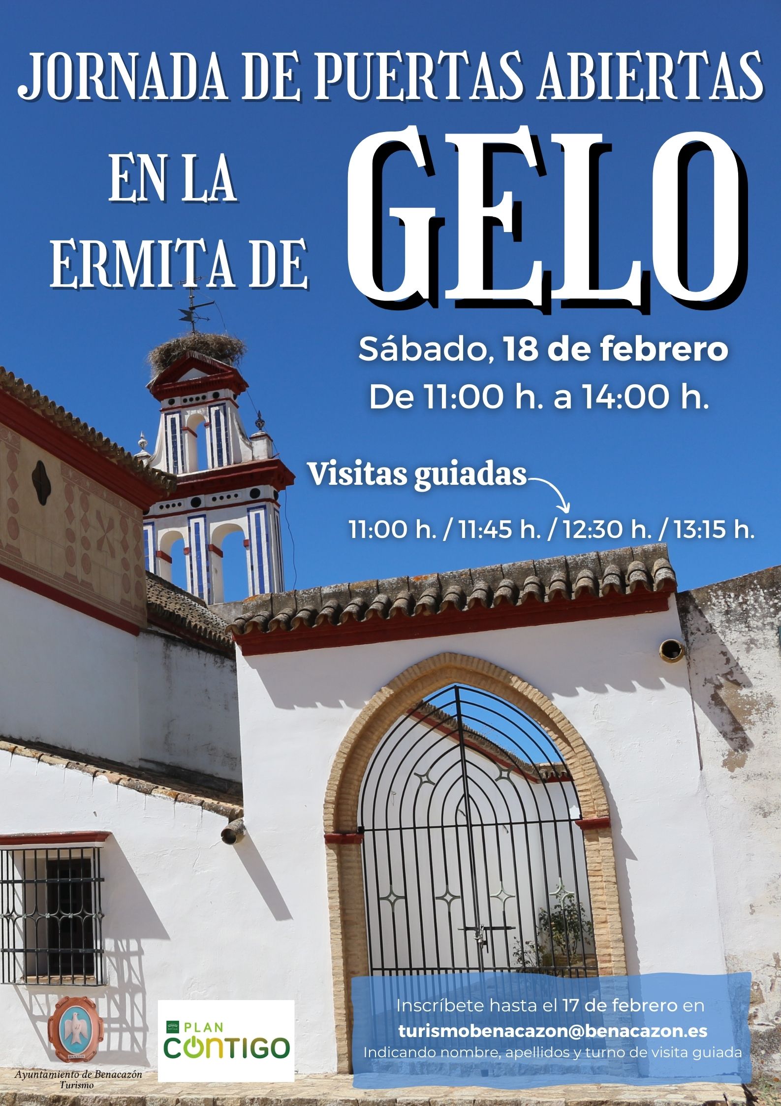 El Ayuntamiento de Benacazón informa sobre la JORNADA DE PUERTAS ABIERTAS DE LA ERMITA DE GELO, actividad organizada por la Concejalía de Turismo y guiada por el Animador Turístico municipal Julio Adame Ortiz -a través del Programa de Empleo y Apoyo Empresarial (Plan Contigo) de la Diputación de Sevilla-. La jornada consistirá en una Visita y Charla Informativa de la Historia de la Ermita, con la finalidad de potenciar el conocimiento de nuestro patrimonio de interés cultural y turístico.