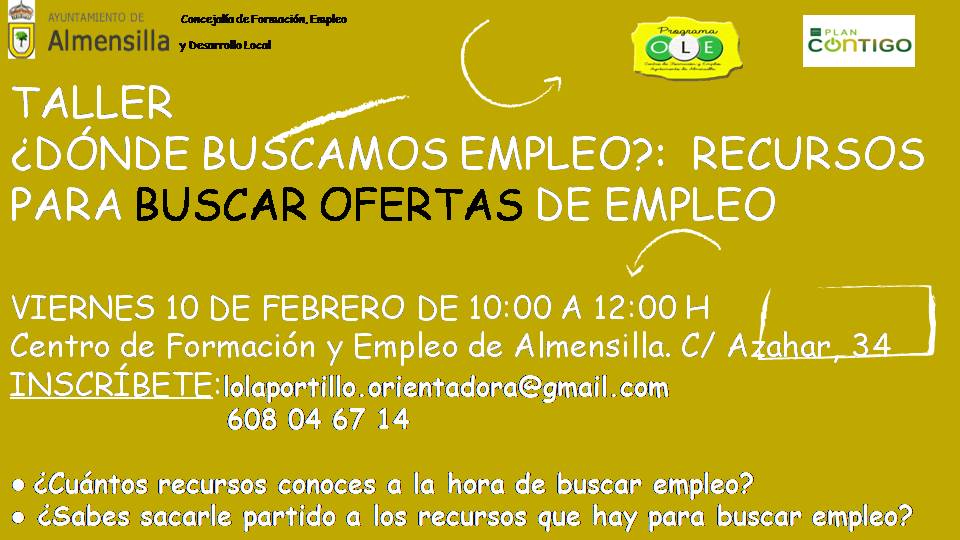 Informamos del próximo taller '¿Dónde buscamos empleo?: Recursos para buscar ofertas de empleo', que se realizará en el Centro de Formación y Empleo municipal el viernes 10/02/23 dentro del Programa O.L.E, en el marco del Plan Contigo de la Diputación de Sevilla.