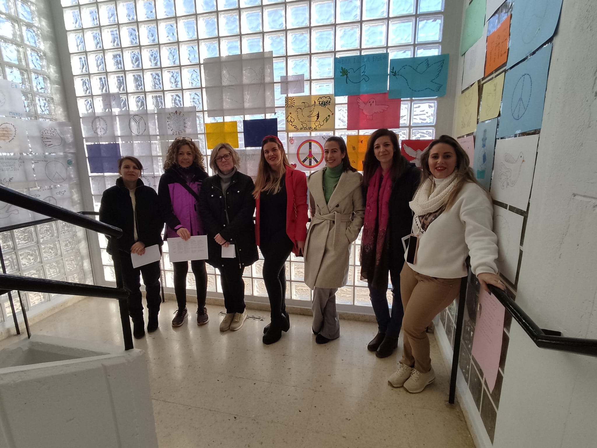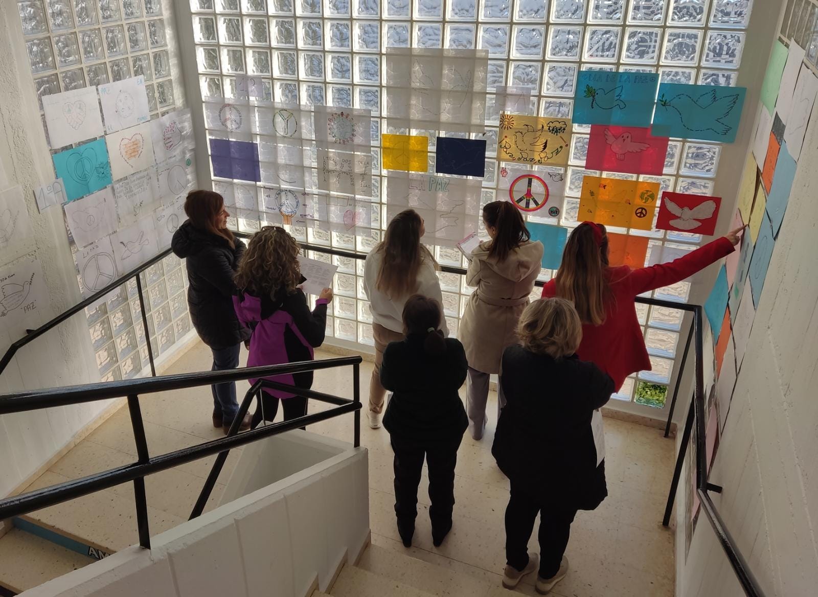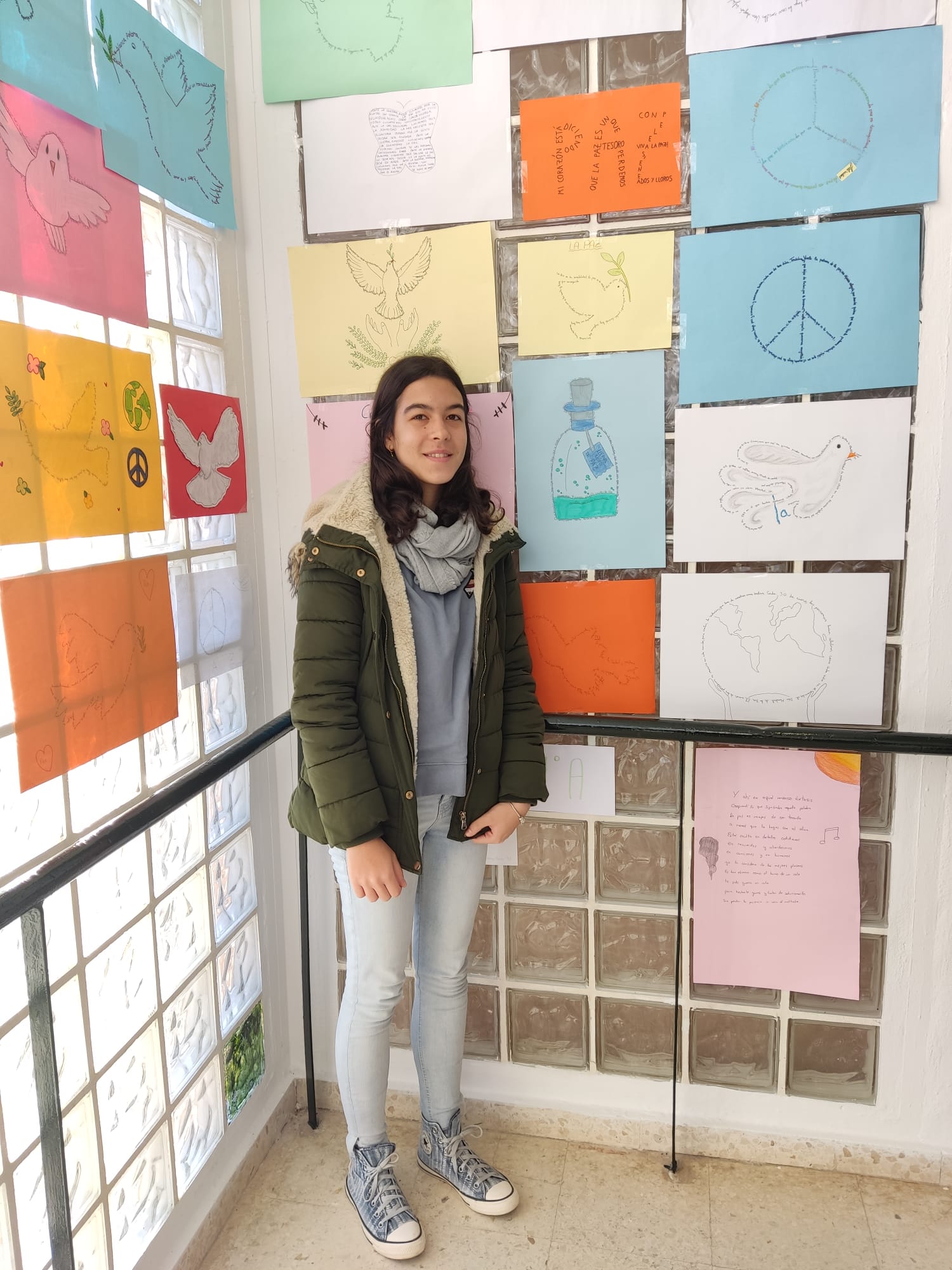 Los alumnos y alumnas de los distintos cursos han elaborado originales caligramas sobre la paz que han decorado la cristalera de las escaleras que suben a la primera planta del edificio principal.