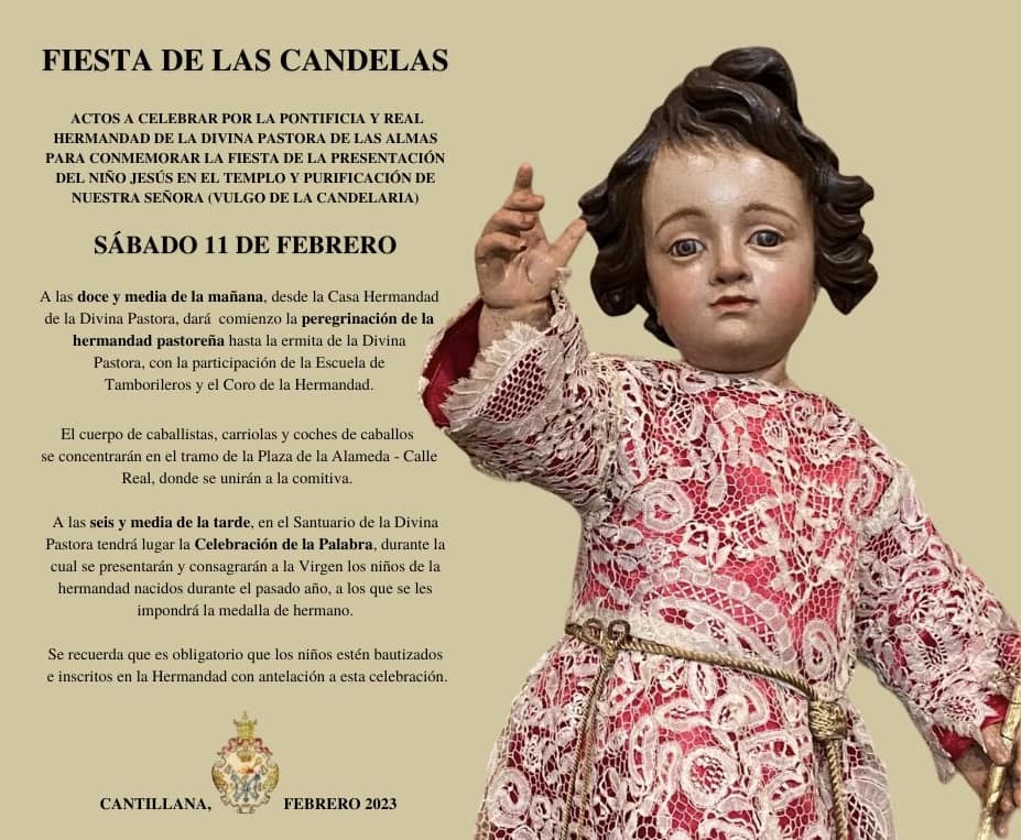 Para conmemorar la festividad de la presentación del Niño Jesús en el templo y Purificación de Nuestra Señora, también conocida como fiesta de la Candelaria, el próximo sábado 11 de febrero, la Hermandad de La Divina Pastora de las Almas, realizará a partir de las 12:30, una peregrinación desde su Casa de Hermandad hasta la ermita de la Divina Pastora, con la participación de la Escuela de Tamborileros y el Coro de la Hermandad, así como caballistas, carriolas y coches de caballos que se concentrarán en el tramo de la Plaza de la Alameda-Calle Real, donde se unirán a la comitiva.