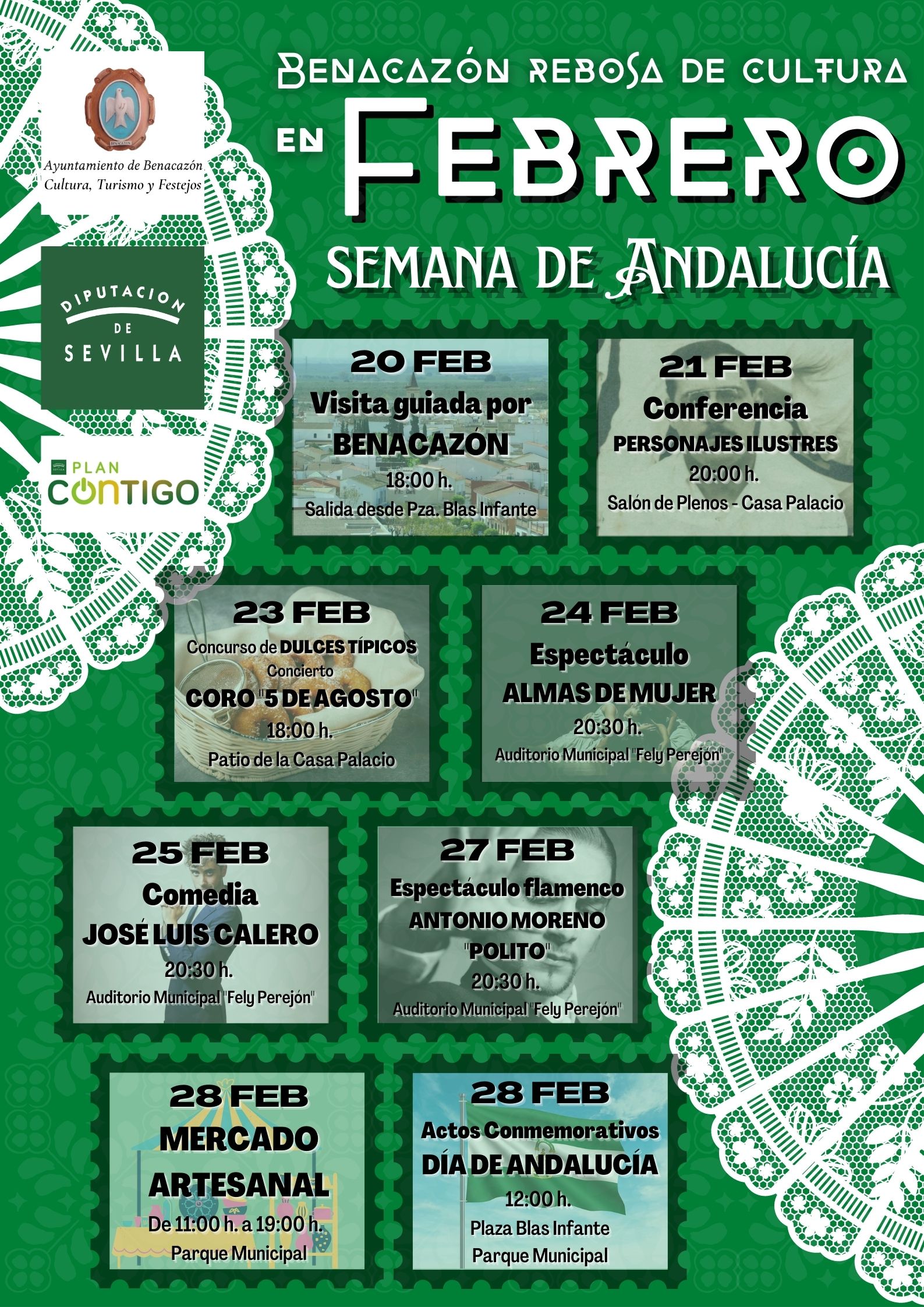 El Ayuntamiento de Benacazón informa sobre el despliegue de actividades que disfrutaremos en la "SEMANA DE ANDALUCÍA", organizadas por las Concejalías de Cultura, Turismo y Festejos, dentro de la Programación "Benacazón Rebosa de Cultura en Febrero".