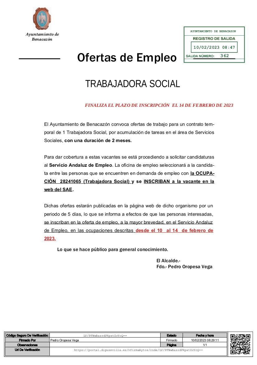 El Ayuntamiento de Benacazón informa sobre la convocatoria de la oferta de trabajo para un contrato temporal de 1 Trabajador/a Social, por acumulación de tareas en el área de Servicios Sociales, con una duración de 2 meses.