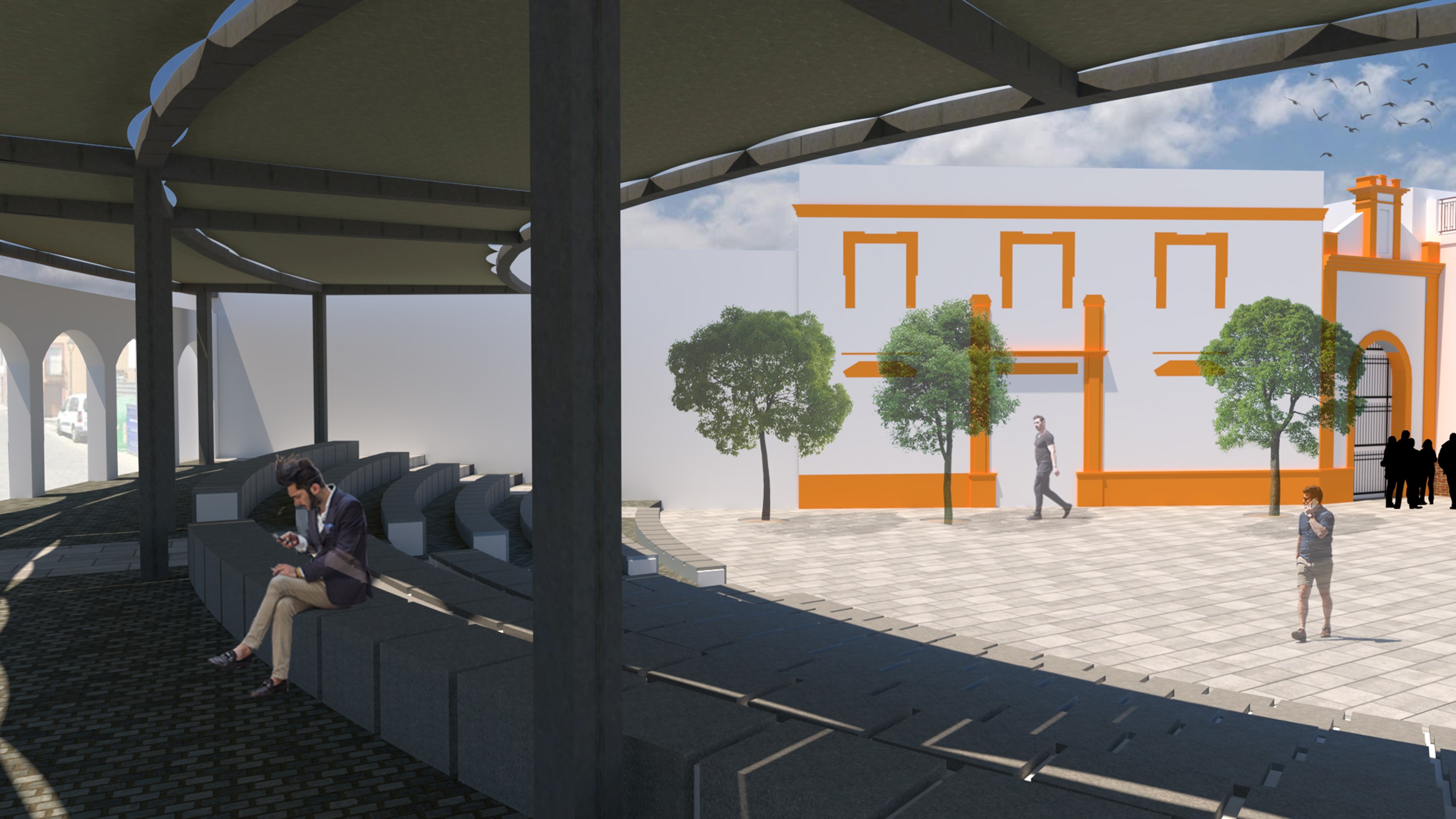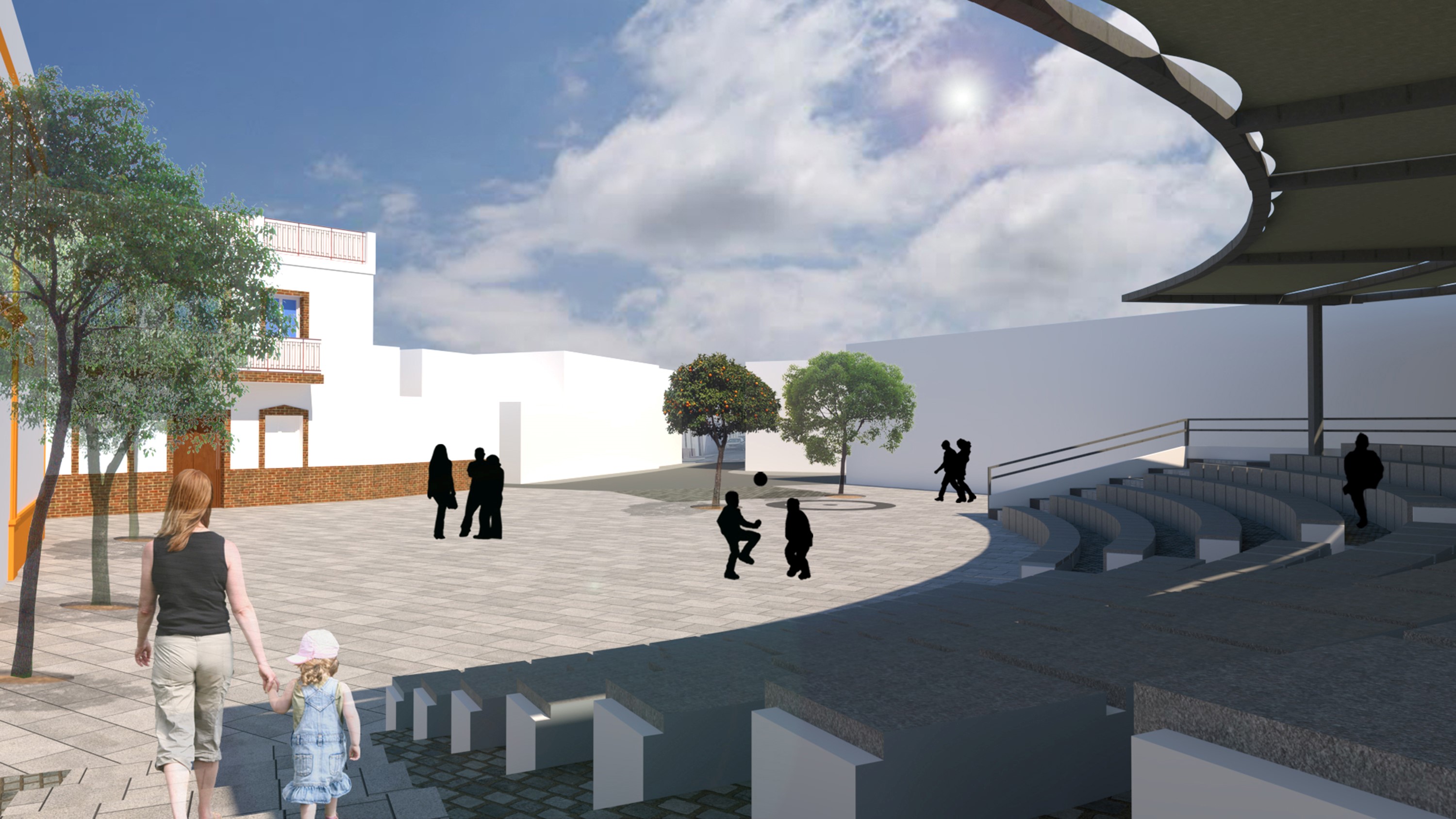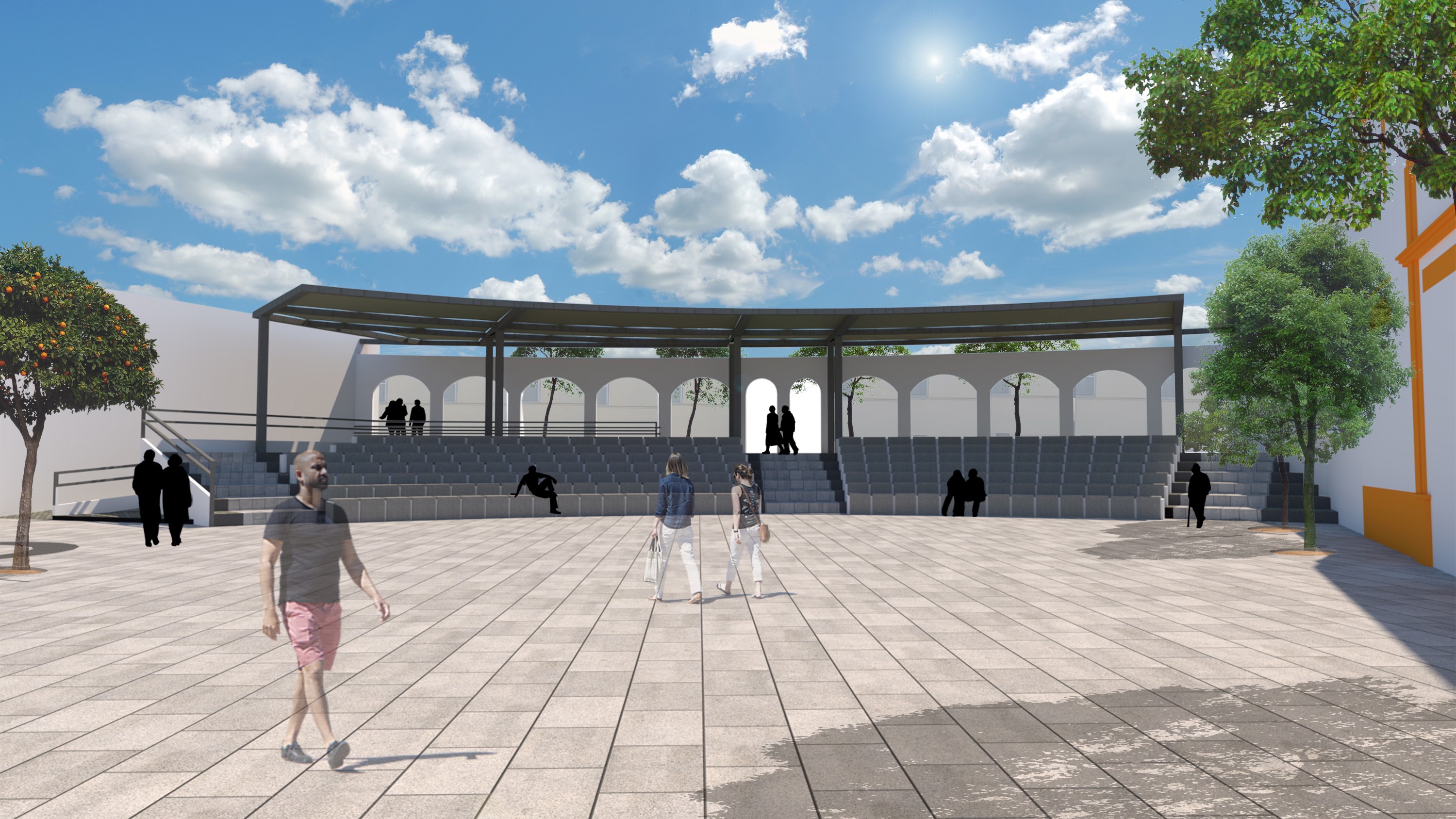 Adecentamiento y ampliación del graderío, disposición de elementos de sombreamiento en ménsula para la zona del graderío, mejora del pavimento de la plaza para facilitar el tránsito, embellecimiento con mobiliario urbano y escultura, nueva iluminación para la realización de actividades, arbolado dispuesto perimetralmente a la nueva zona peatonal. Además, se habilitará en el graderío una zona específicamente diseñada para las personas con movilidad reducida para mejorar la accesibilidad a la misma.