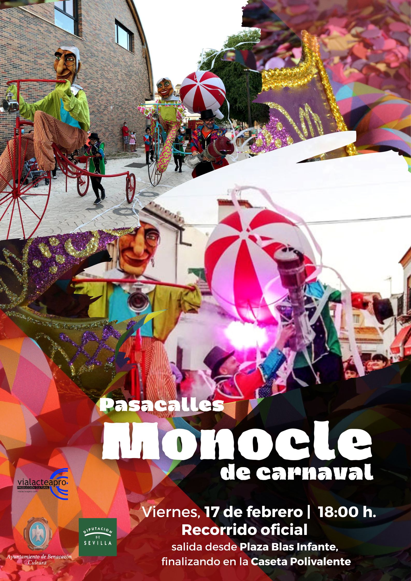 El Ayuntamiento de Benacazón informa que el próximo Viernes 17 de Febrero disfrutaremos del original Pasacalles de Carnaval "MONOCLE", que partirá a las 18:00 h. desde la Plaza Blas Infante e irá por el recorrido oficial hasta finalizar en la Caseta Polivalente del Parque Municipal. Actividad organizada desde nuestra Concejalía de Cultura, adscrita a la Subvención del área de Cultura y Ciudadanía de la Diputación de Sevilla, para la realización de actividades culturales municipales. La delegada del área, Carmen Rocío Bautista, os invita a disfrutar de este divertido Pasacalles, además de todas las actividades culturales de las que vamos informando.